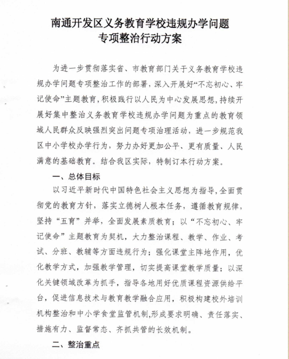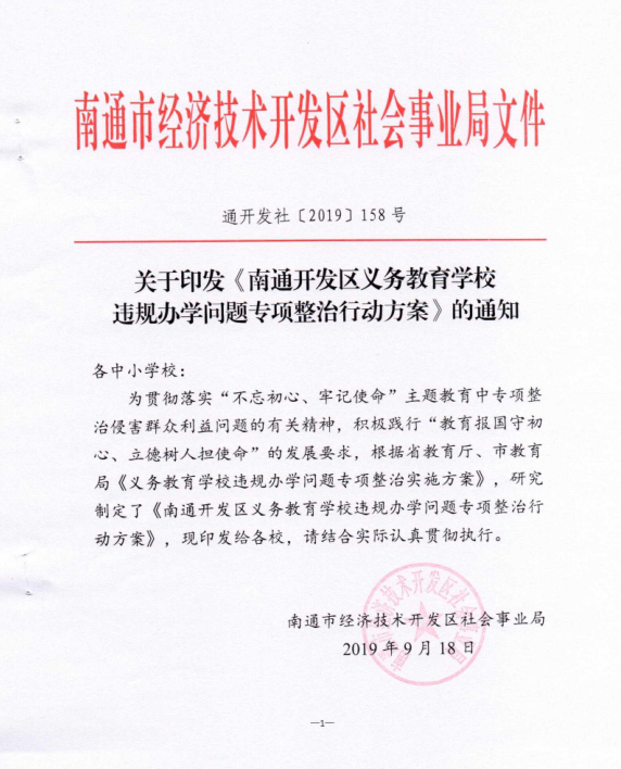 关于印发《南通开发区义务教育学校违规办学问题专项整治行动方案》的通知