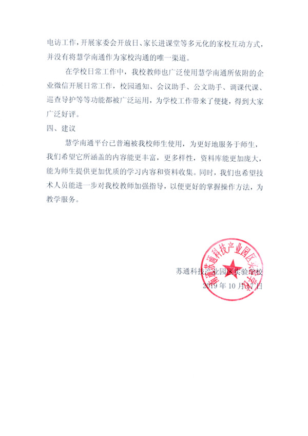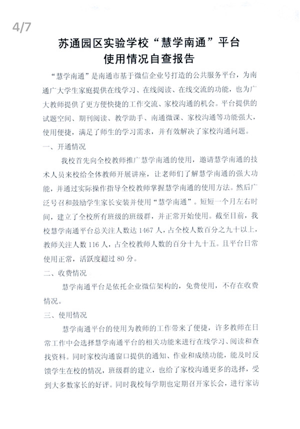 苏通园区实验学校慧学南通平台使用情况自查报告