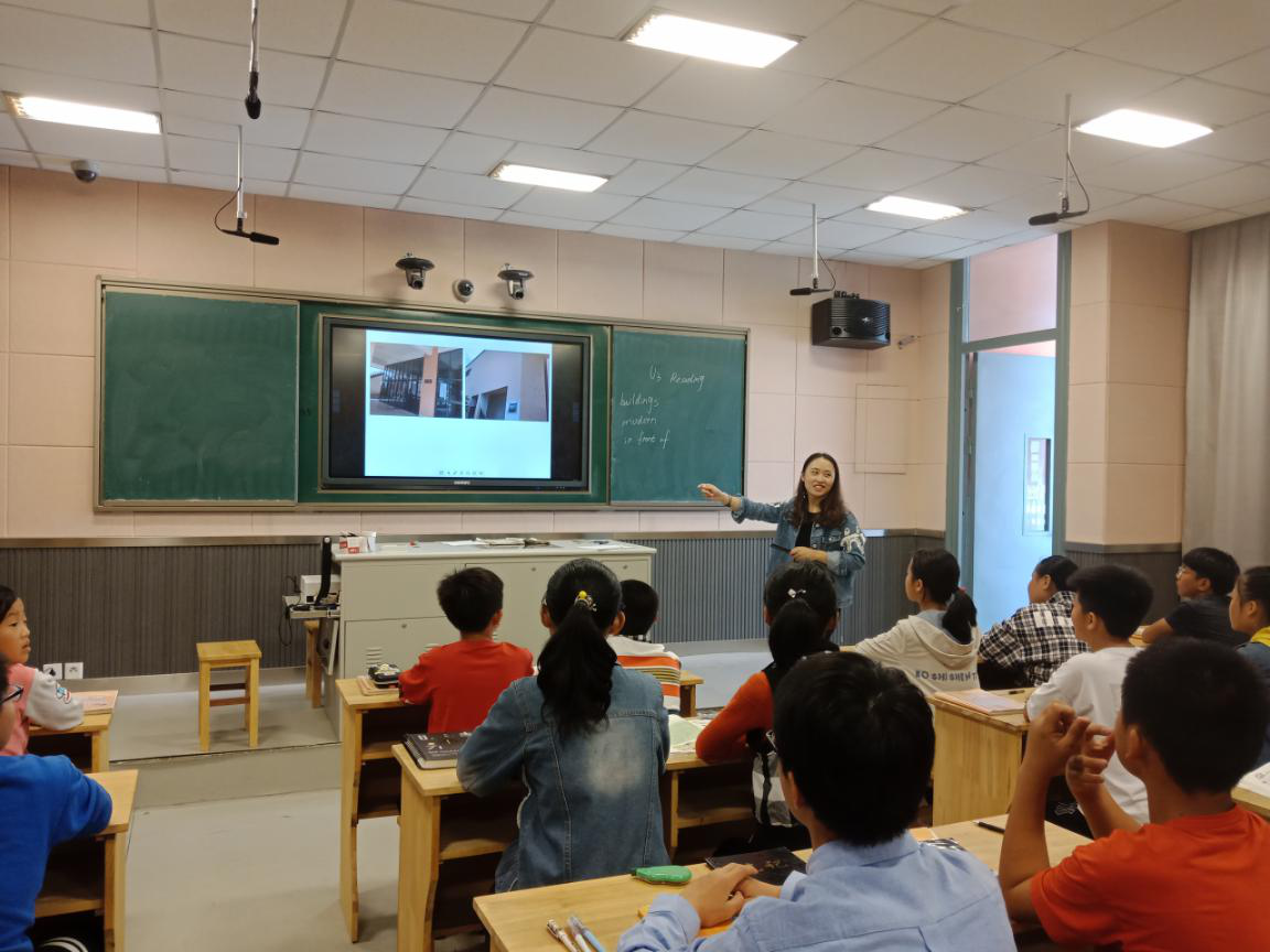 英语老师王月通过不同学校的图片对比,让学生珍惜现在的学习环境。