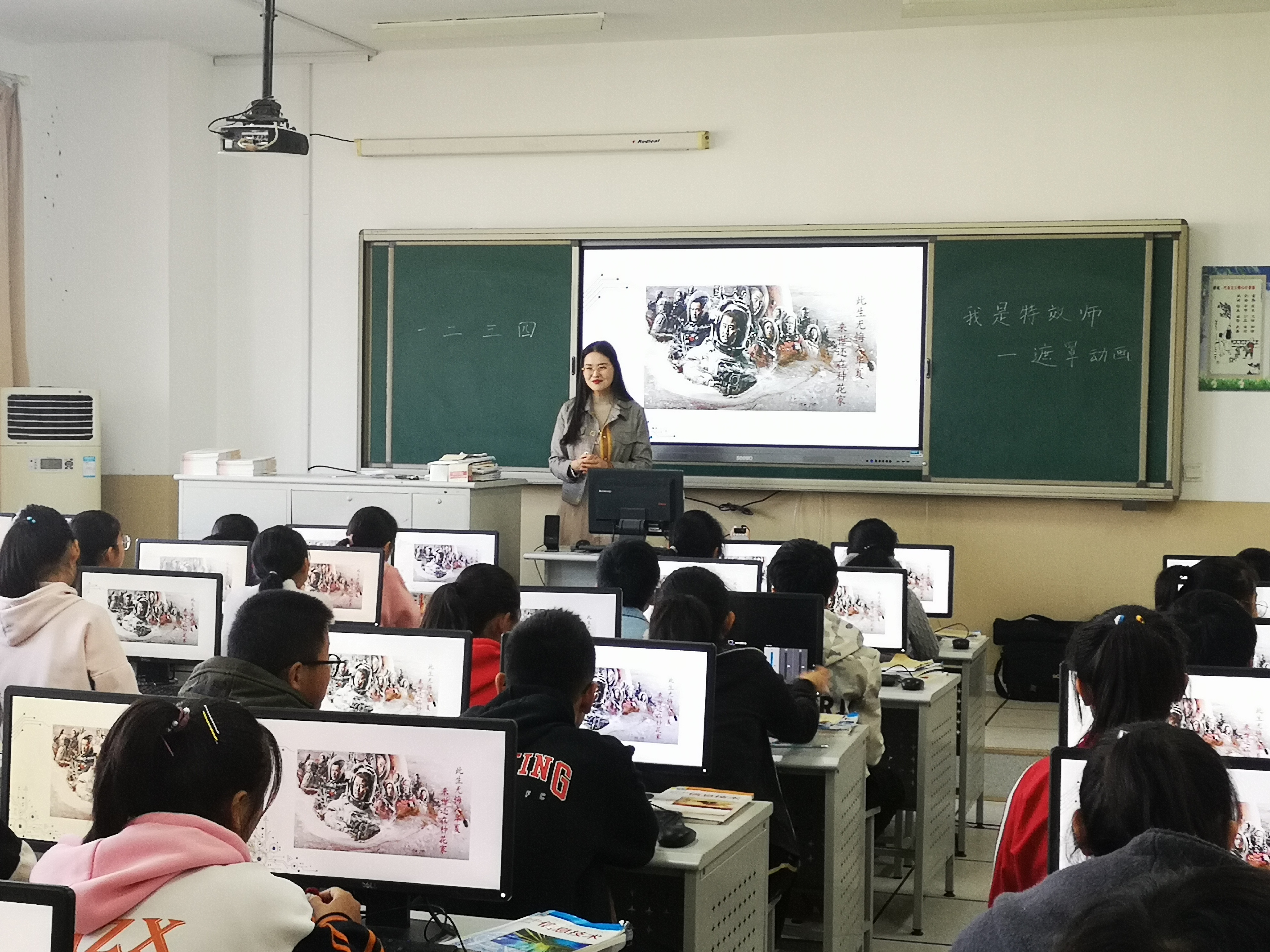张鑫羽老师执教了《我是特效师—遮罩动画》,张老师以贴合学生的电影《流浪地球》和《哪咤之魔童降世》为素材,以形状补间动画为基础,制作了生动有趣的探照灯效果的遮罩动画,学生在做中感受着flash的神奇。
