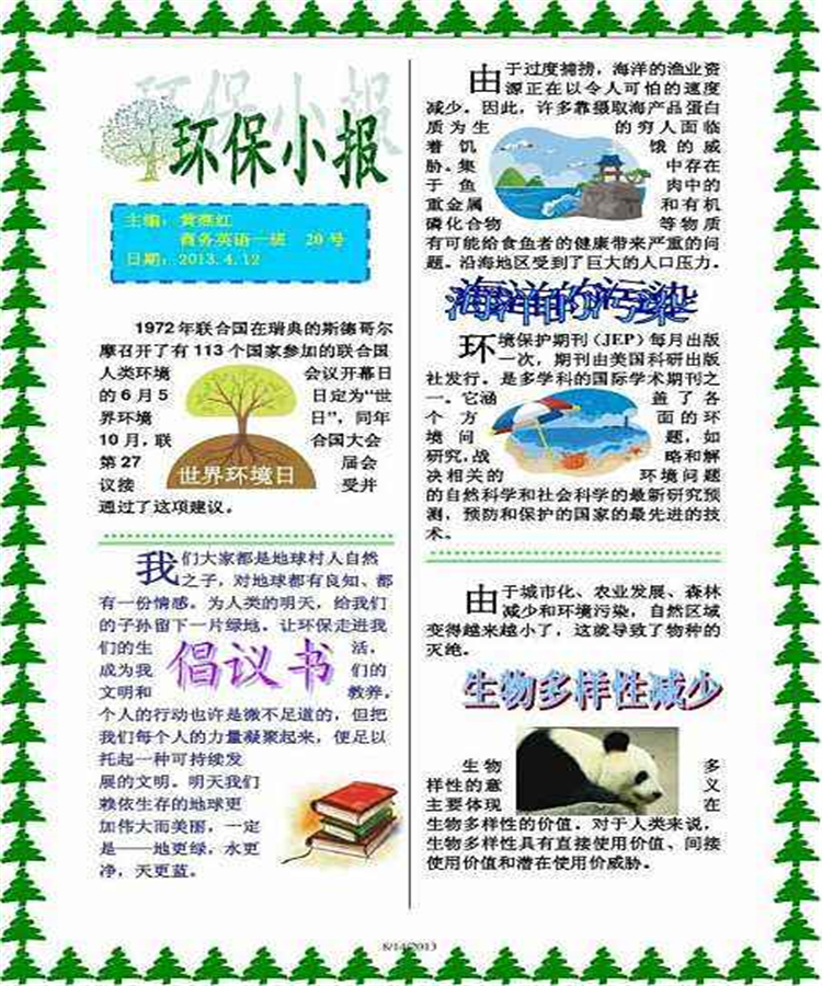 为了增强同学们的环保意识,弘扬生态文明,南通市天星湖中学高一年级开展了以“弘扬生态文明,争当绿色使者”为主题的手抄报比赛。
