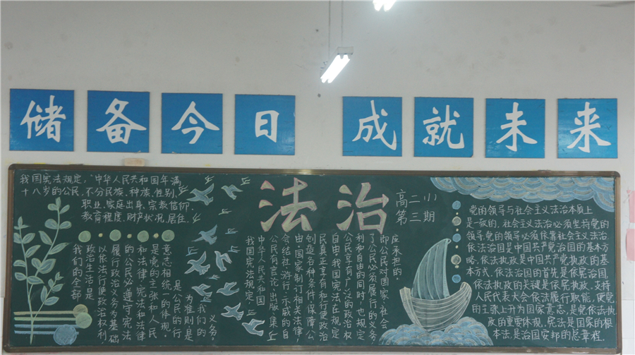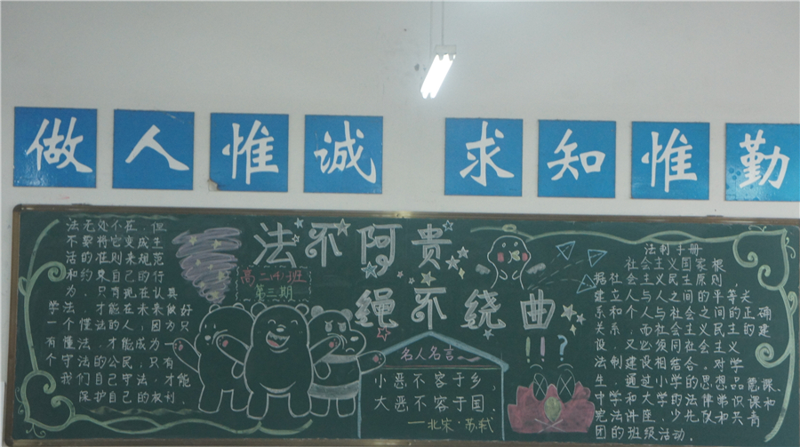 宪法是国家的根本大法,是治国安邦的总章程。为宣传国家宪法日主题教育,南通市天星湖中学组织了一系列“学宪法、讲宪法”教育活动,为实现深入学习和实际相结合,12月5日,我校开展了以“学习宪法、弘扬法治”为主题的黑板报评比活动。
