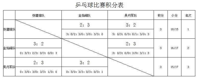 经过三轮循环比赛出现了戏剧性一幕,金灿峰队3:2赢张建锋队,吴丹军对3:2赢金灿峰队,张建锋队3:2赢吴丹军队,每队交叉比赛后各队大比分均相同。经裁判组与三小队队长共同结算比赛小局分后,张建锋队赢18局输15局,金灿峰队赢16局输17局,吴丹军队赢15局输17局,由小局分分出一、二、三名。