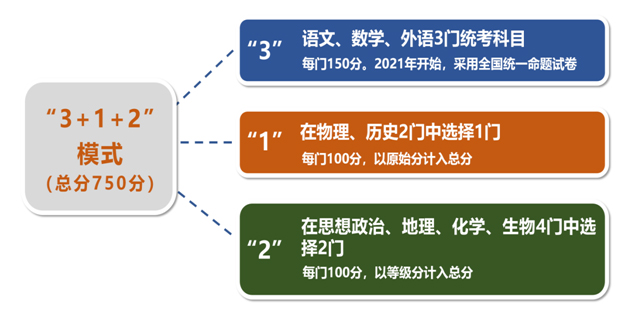 江苏省新的高考模式可简称为“3+1+2模式”。“3+1+2”模式是指:“3”为统一高考科目语文、数学、外语;“1”为首选科目,考生须在高中学业水平选择性考试的物理、历史科目中选择1科;“2”为再选科目,考生可在化学、生物、思想政治、地理4个科目中选择2科。考生的选择性考试科目,须符合高校要求,方可报考相关专业(类)。