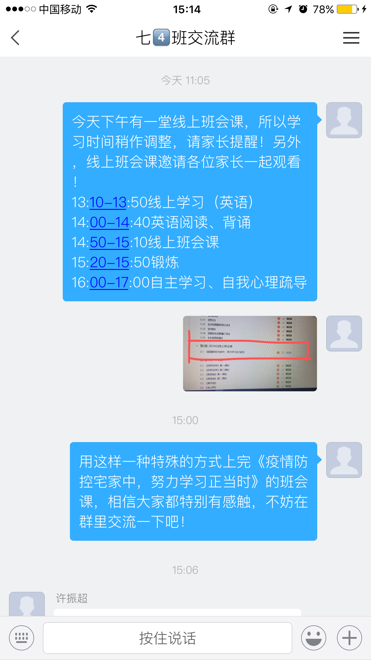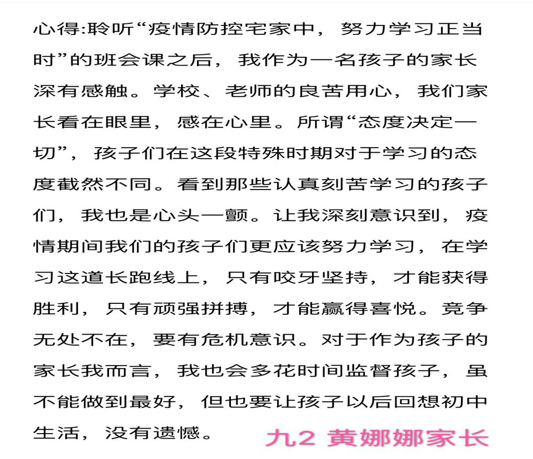 在全国上下一心抗击新型冠状病毒疫情的关键时刻,为加强疫情期间家校沟通交流,引导学生做好自我防疫,促进学生进一步适应网课学习,养成良好的居家学习和生活习惯,3月16日下午,南通市竹行中学各班级开展了“疫情防控宅家中,努力学习正当时”的线上班会课活动,本次班会还邀请了家长朋友一起参加。