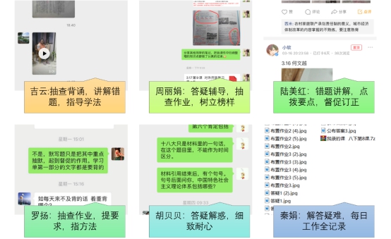 各科任教师结合年级互研内容及年级课程安排表,通过微信群为本班学生每天推送学习课程,进行在线辅导并及时进行在线反馈,指导本班学生的网上学习、QQ群辅导答疑及网络作业批改。