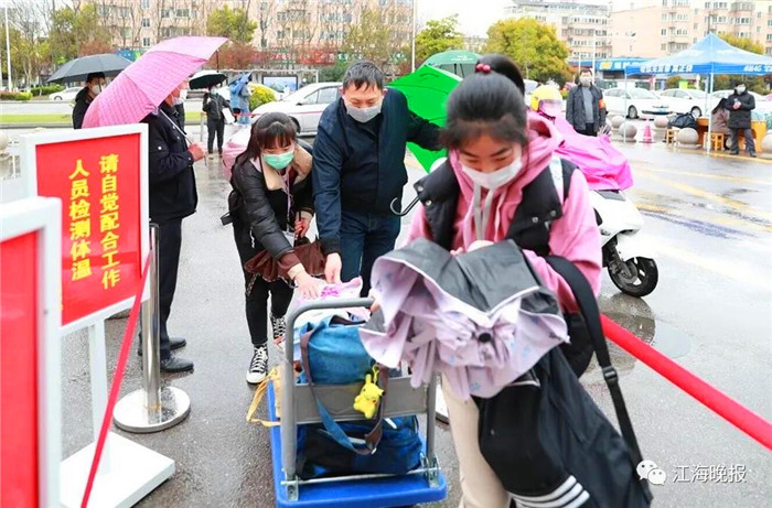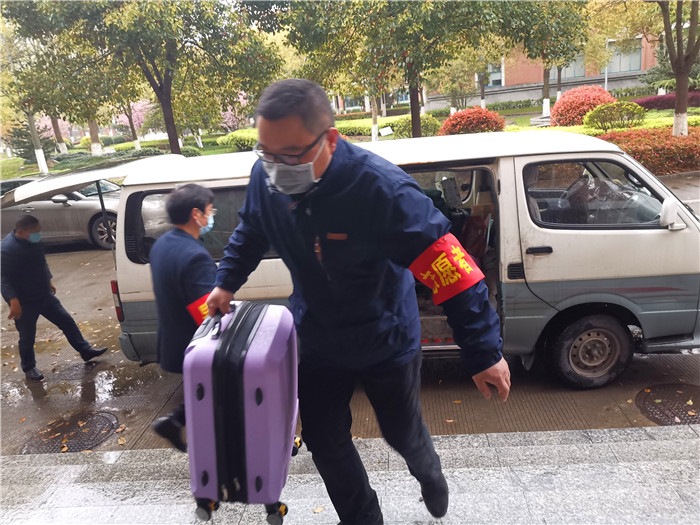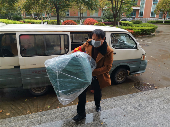 志愿者队长徐新民校长冒雨给学生运送行李