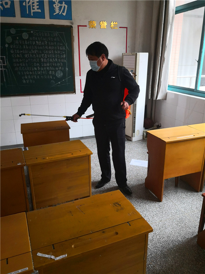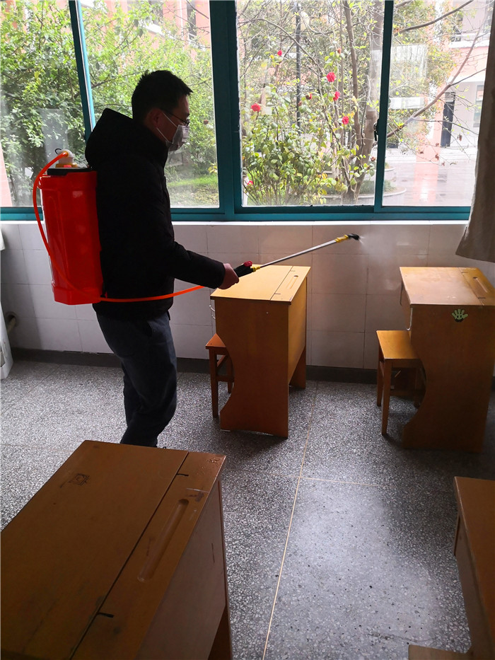 党员志愿者对教学区进行84喷洒消毒