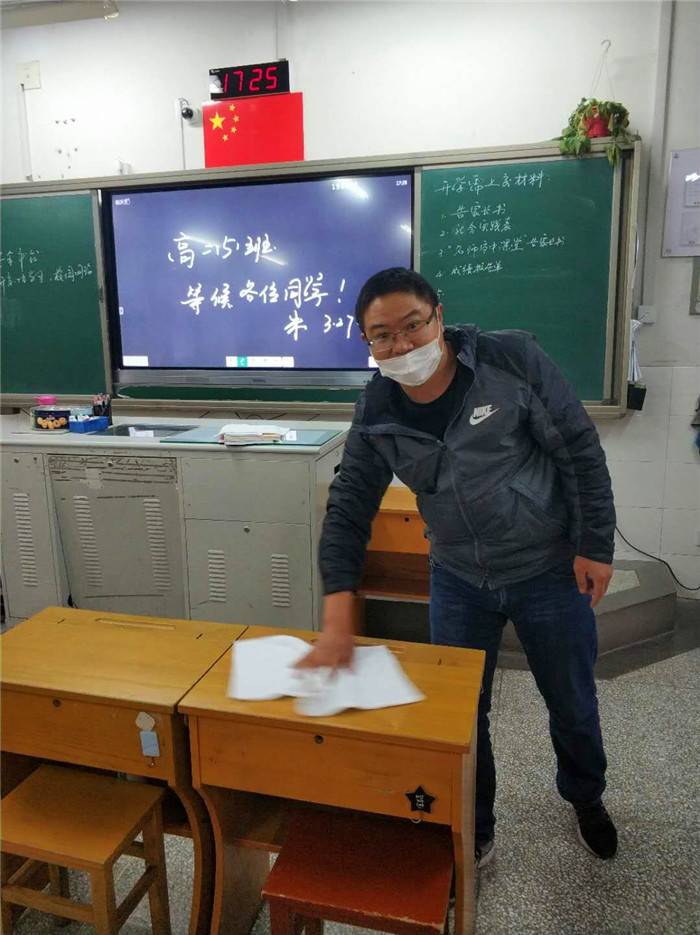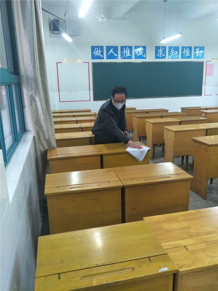 党员志愿者对课桌椅进行酒精擦拭消毒