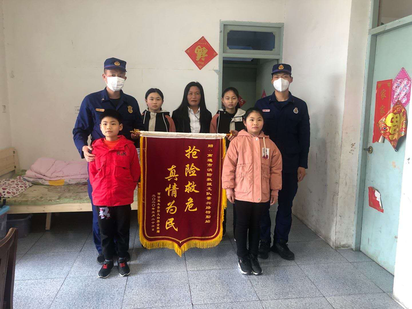 上午10时20分左右,住在开发区竹行街道一间民房三楼的何璐正和弟弟妹妹在房间里上网课,她闻到楼道和外面有股很浓的烟味,立马意识到是哪里着火了,因为在学校进行了消防演练,学习过消防知识,何璐同学没有慌张,她沉着地打电话给上班的爸爸妈妈,后带着3个弟弟妹妹来到卫生间,打开窗户,用湿毛巾捂住口鼻等待消防救援,何璐父母在拨打119后连忙回家,心急如焚的何爸爸想冲上来救孩子,却因烟火太大,没有成功,机智的何璐就从楼上扔了一条湿毛巾给爸爸,何爸爸用湿毛巾捂住口鼻上了楼,却也被困在了三楼。消防支队景兴路特勤站的消防人员到场后迅速展开救援,经过20多分钟紧张救援,成功营救出一家五口人,也把二楼的火灾扑灭了。