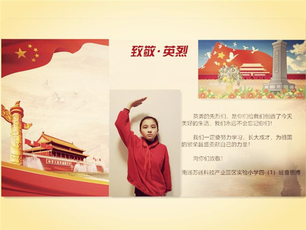 4月4日,清明,全国哀悼,深切表达对抗击新冠肺炎疫情牺牲的烈士和逝世同胞的悼念;苏通园区实验学校少先队员们礼敬先烈,寄语英雄,传承红色基因,弘扬优秀传统文化。