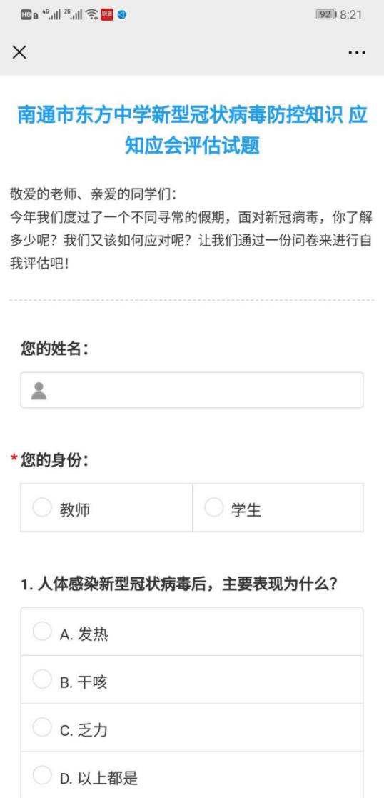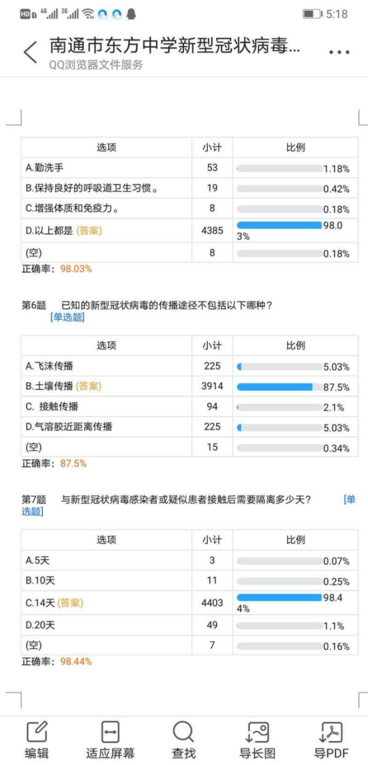 4月1日,由政教处牵头,在党政办和信息办的支持下,全体师生参加了“东方中学疫情防控应知应会开学第一考”活动,从答题的结果来看,全体师生的正确率较高。