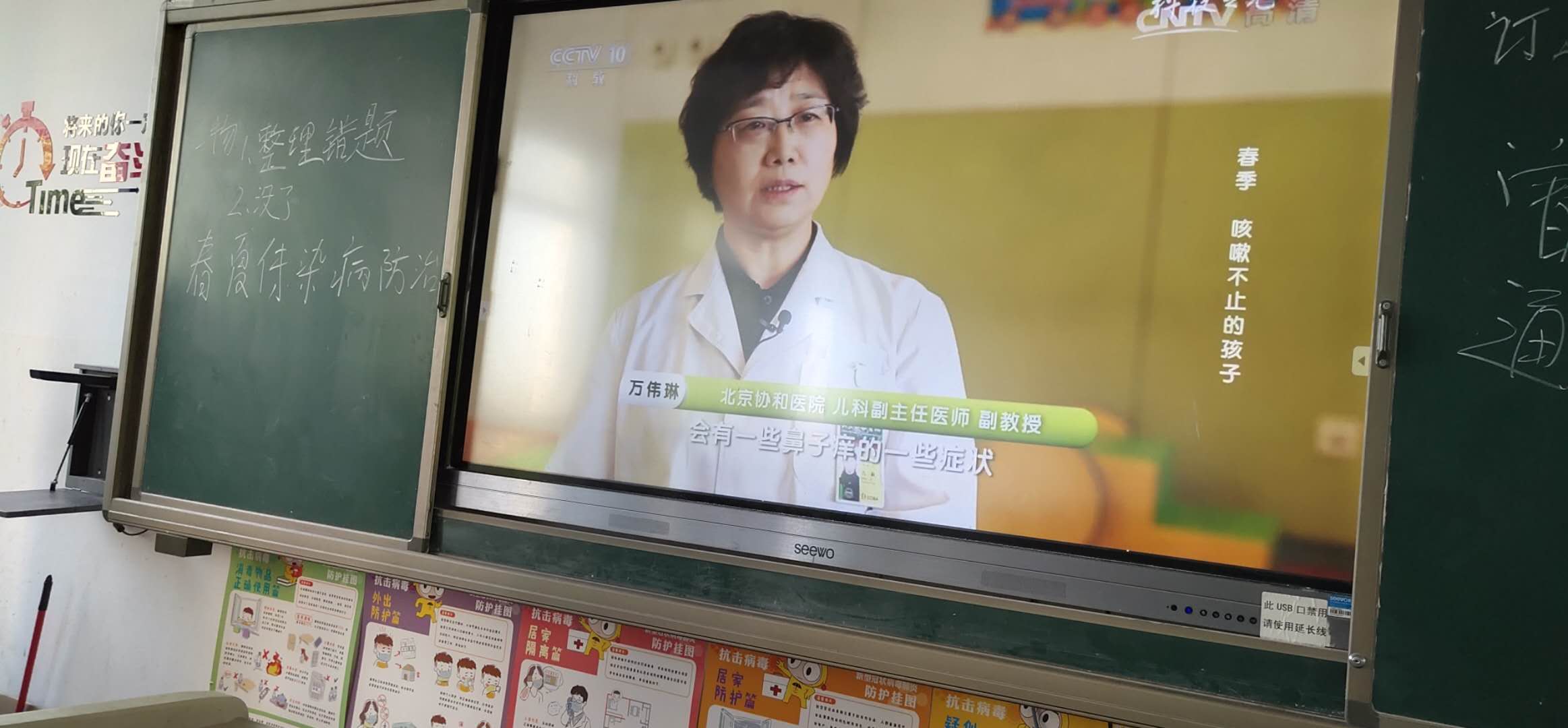 老师们通过视频和讲解,向大家介绍了春夏季多发传染病的类型、症状、传播途径,尤其是对流感的流行特点及预防措施进行全面详细的介绍,要求同学们日常生活中一定要养成良好的个人习惯,家里、教室要开窗通风,保持空气流通,多喝水,多锻炼,增强免疫力。