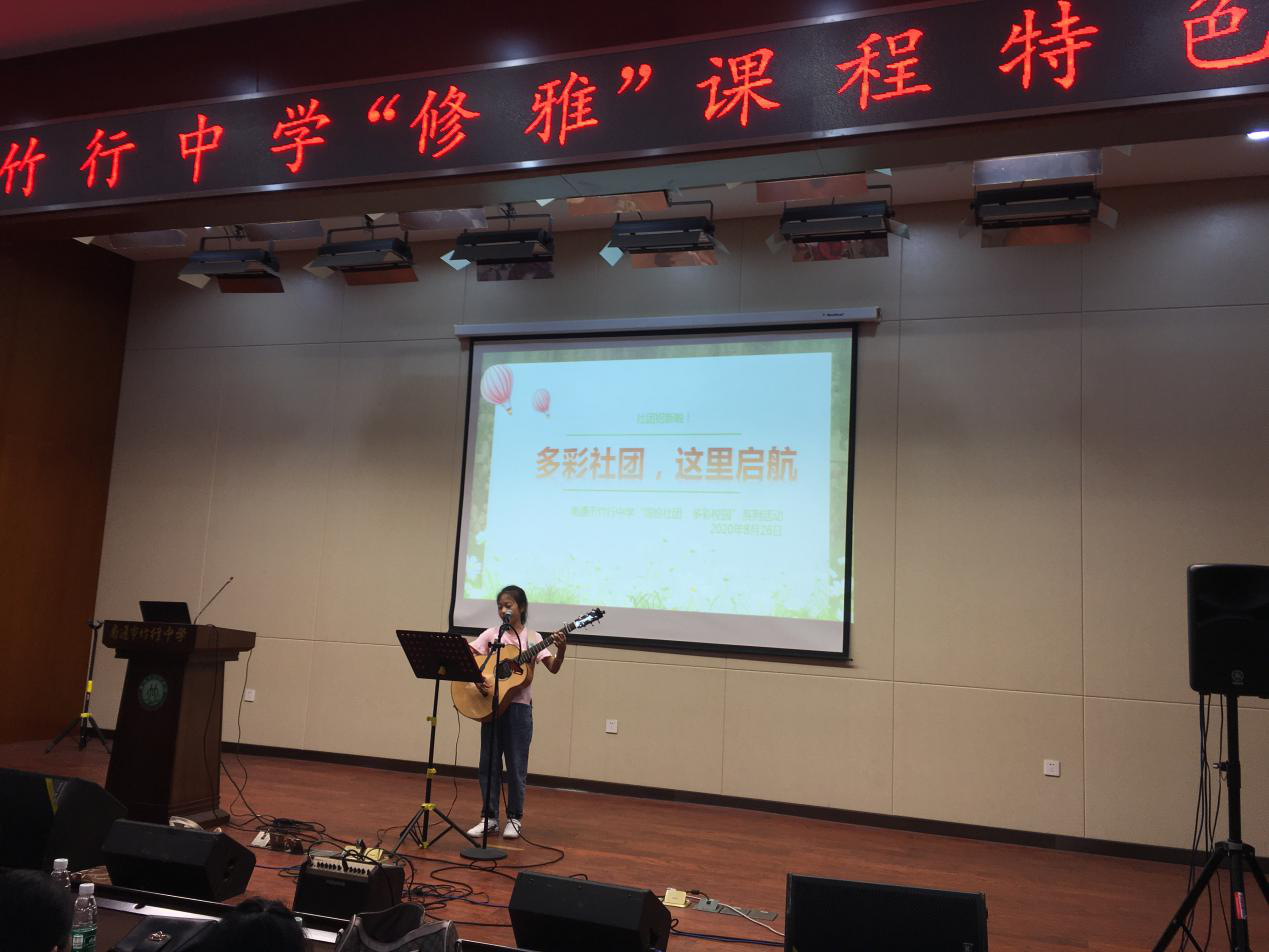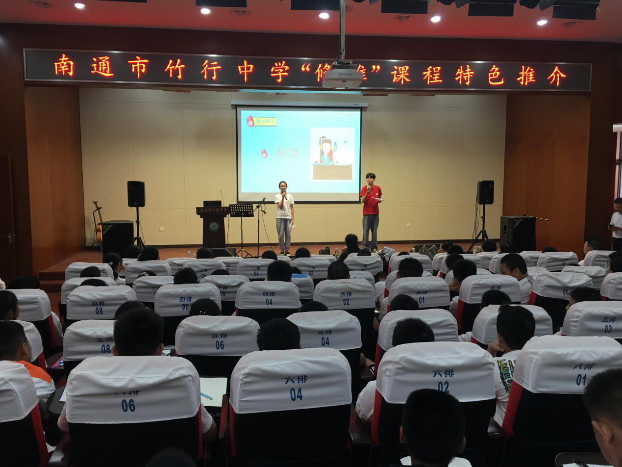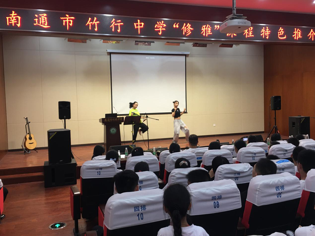 下午,全体新生齐聚报告厅参加南通市竹行中学“修雅”课程特色推介活动。我校舞蹈、声乐、茶艺、武术等17个社团负责人一一上台介绍展示,给大家呈现了一个又一个精彩的小世界。
