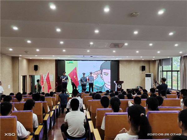 开训仪式上,军训教官领队一大队副大队长袁飞在发言中对同学们提出了要求和期望,姚敏校长以“天时地利人和”这句话来形容此次的军训,并向本次负责军训的教官们授旗。