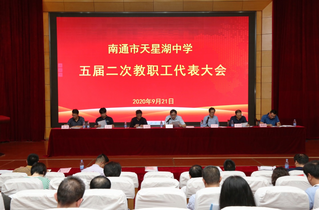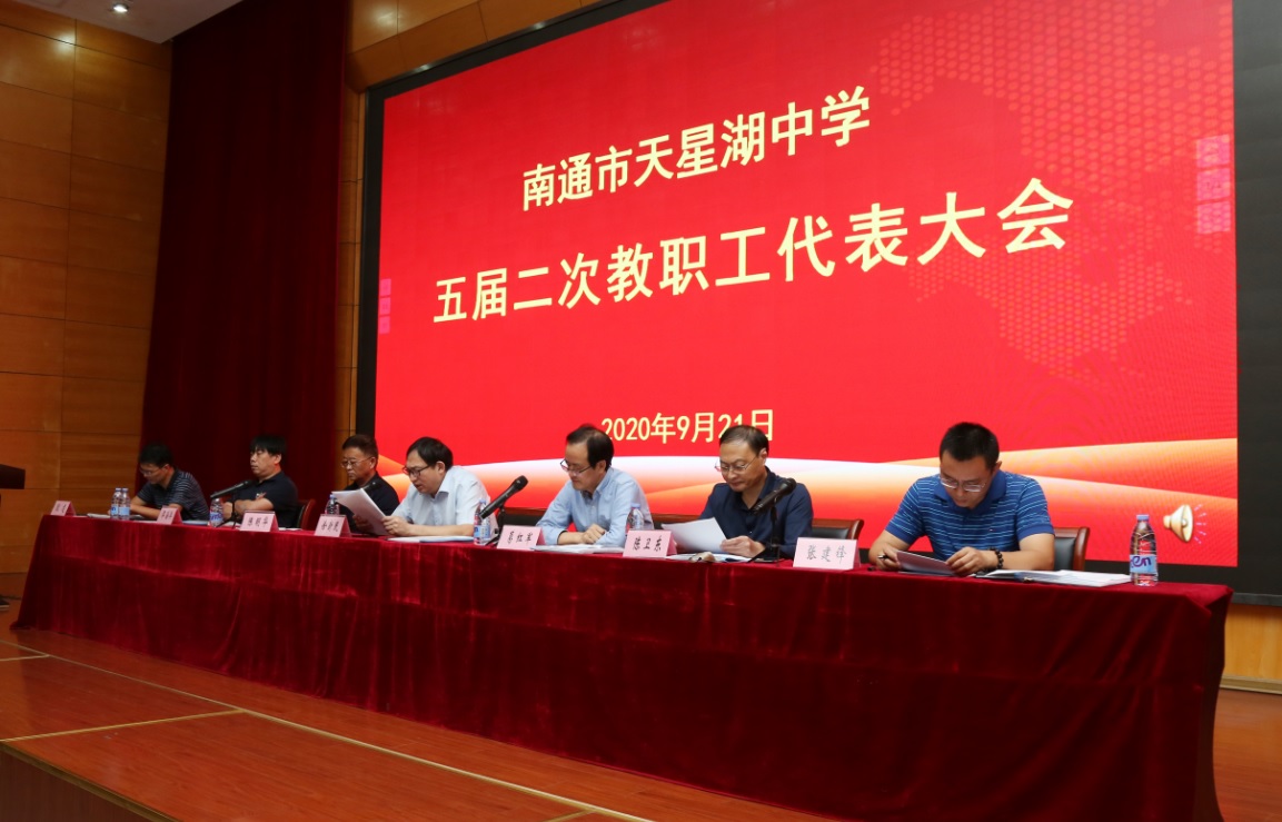 学校工会于2020年9月5日向学校党委递交了关于召开南通市天星湖中学五届二次教职工代表大会的申请报告,学校党委、校长室同意并于2020年9月17日召开了南通市天星湖中学五届二次教职工代表大会筹备工作会议。今天下午4:30在学校滋兰楼报告厅隆重举行学校五届二次教代会开幕式,学校教职工代表出席会议,其余教职工列席会议。