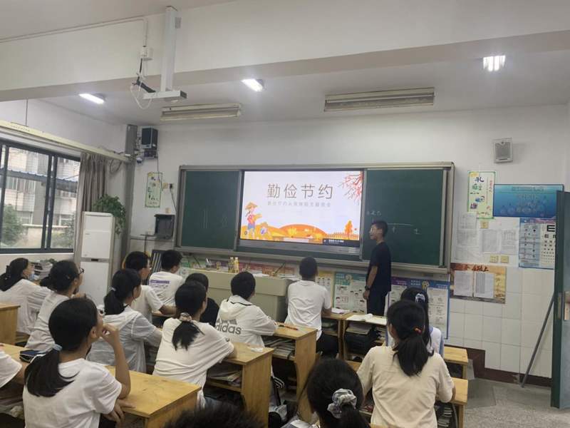班会课上,师生们通过课件、展示课前收集的资料、讨论等多种形式,教育学生传承和发扬中华民族勤俭节约的优良传统,鼓励同学们从身边的小事做起,形成勤俭节约的美德。