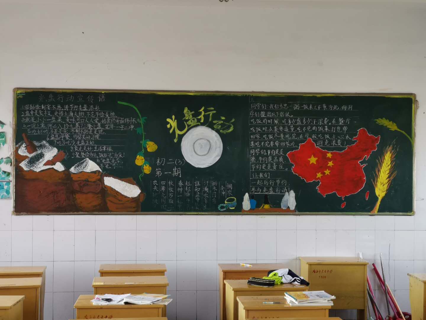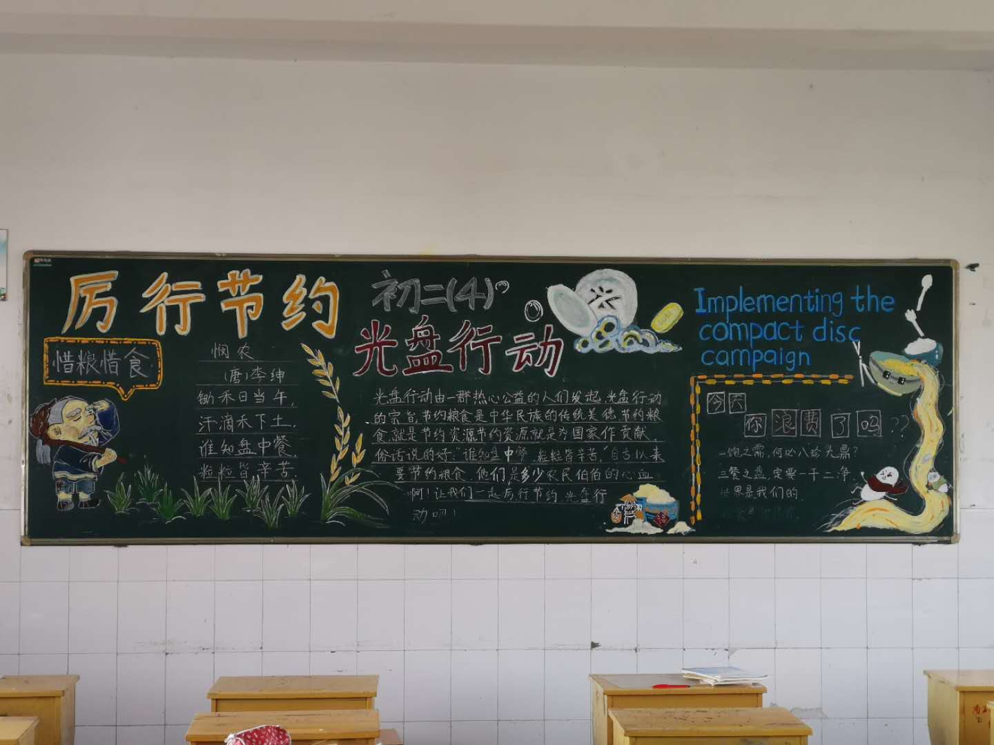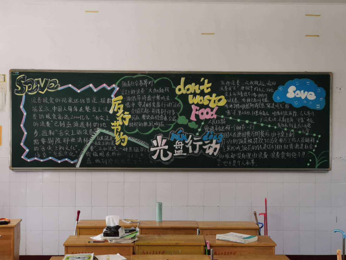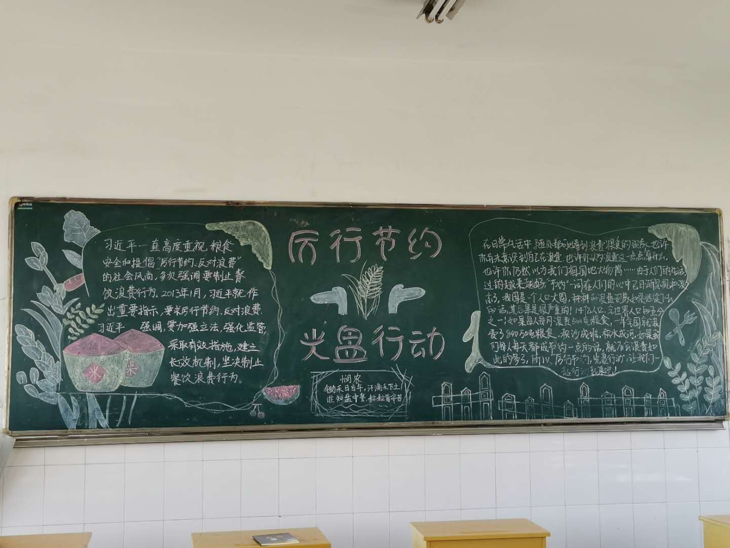 静以修身,俭以养德。为坚决制止餐饮浪费行为,进一步提升师生勤俭节约意识,9月,校政教处组织开展了“厉行节约 光盘行动”主题黑板报活动。
