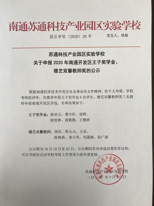 苏通科技产业园区实验学校 关于申报2020年南通开发区王子奖学金、 德艺双馨教师奖的公示