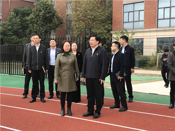 在园区学校党支部书记、校长姚敏的陪同下,王凯书记一行参观了校园,了解了学校办学成绩,对学校跳绳与古诗文两大特色项目表示赞赏。来到刚刚竣工,即将投入使用的学校标准化操场,王凯书记对新操场的建设给予充分肯定,并对学校未来的三期工程规划作出了明确指示。