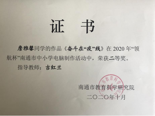 近日,南通市教科院公布了2020年南通市“领航杯”中小学电脑制作活动评比结果。我校初二16班顾问同学的3D创意设计作品《智能分类垃圾桶》荣获大市一等奖,初三19班詹雅馨同学的绘画作品《奋斗在“疫”线》荣获大市二等奖。