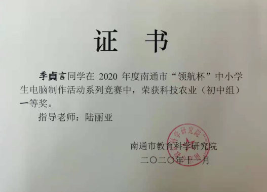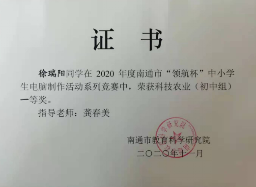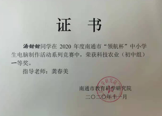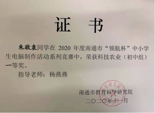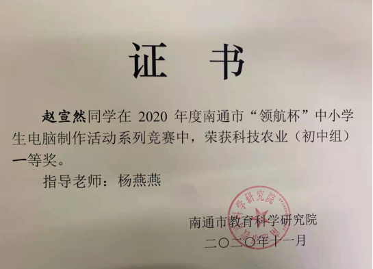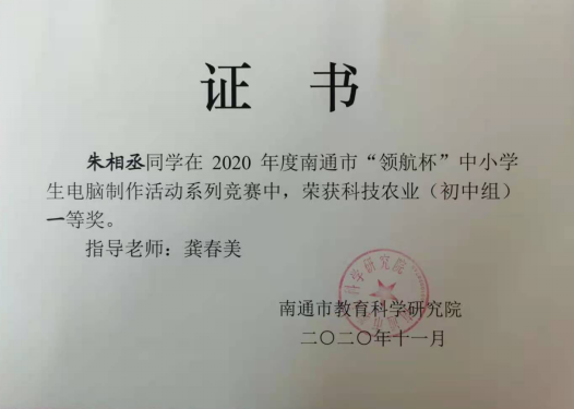 2020年“领航杯”南通市创客竞赛活动在海安市开发区实验学校举行,我校15名学生参加了此次的创客科技盛宴。本次大赛包括科技农业、智慧物联两个项目,通过激烈的角逐,我校朱敬袁、汤甜甜、季貞言、徐瑞阳、赵宣然、朱相丞6位同学获得了南通市一等奖,朱张怡、彭煜涵、江楠、周胤辰、黄栋阳、白子涵、刘葛辰、顾问、施家舜9名同学获得了南通市二等奖。