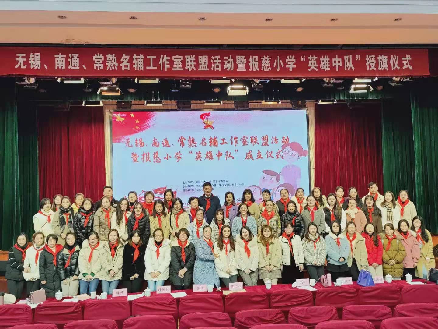 天地英雄气,千秋尚凛然。报慈小学是今日的第一站,为了让英雄事迹深入人心,让英雄精神代代相传,报慈小学启动“传承红色基因,创建英雄中队”主题活动,并向无锡、南通、常熟的辅导员们展示了“李强中队”、“杨利伟中队”、“周恩来中队”、“雷锋中队”、“常德盛中队”、“王淦昌中队”六个英雄中队积极探索、勇于实践的精神面貌。中国少先队工作学会副会长华耀国老师现场给英雄中队授旗,激励全体队员们传承英雄精神,争当时代先锋。