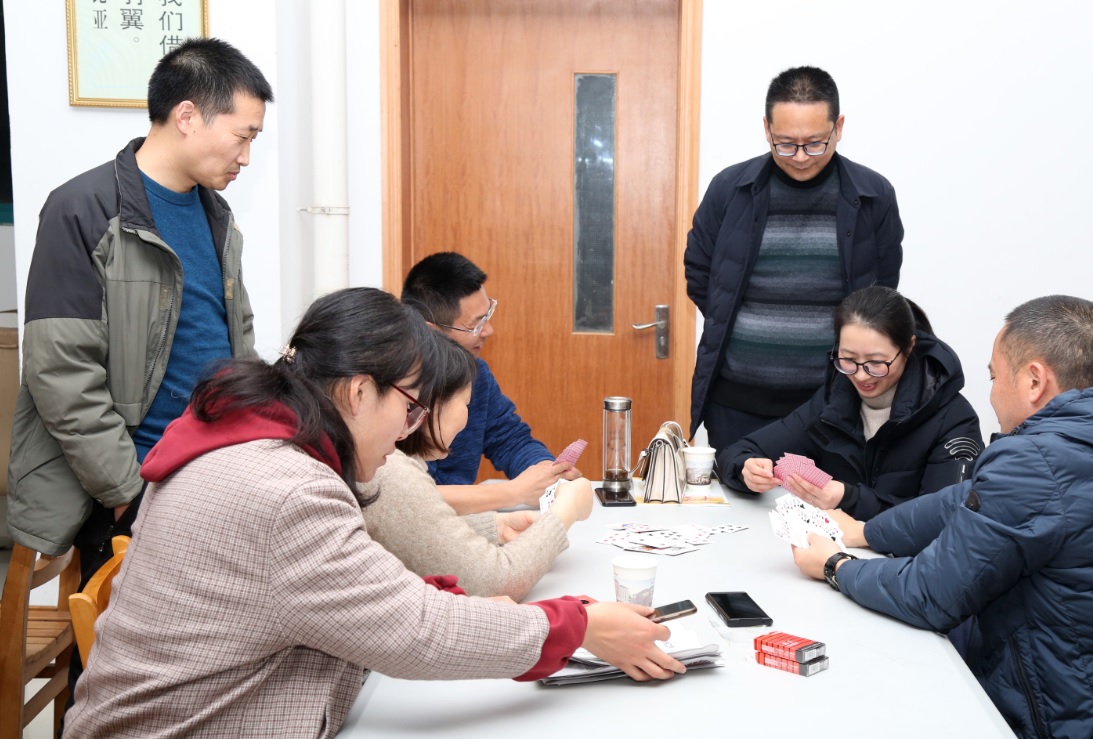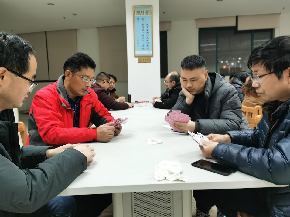 本次活动遵循“公平、公正、公开”比赛规则,比赛采用现场报名,两人一组,自由搭配,今年各位教职工报名最为积极踊跃,共有31组62名选手参加比赛。本次比赛进行三轮抽签比赛采用积分制,每组选手胜一局积2分,另加上本局领先对手的等级分,双方打平各积1分,负方选手不得分。比赛中,各组选手们密切配合,精确计算、沉着应战,对阵双方炫牌技、比智慧,赛成绩、促友谊,比赛现场其乐融融。
