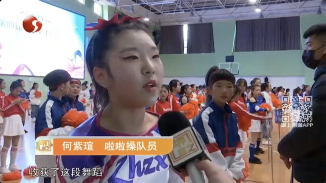 竹中队员的青春活力,吸引了一大批领导和参赛队伍的关注,队员们更有幸接受了南通电视台的采访,队员何紫瑄表示:练习啦啦操的这段时间过得很开心,校“修雅”课程的开设让她收获了许多。