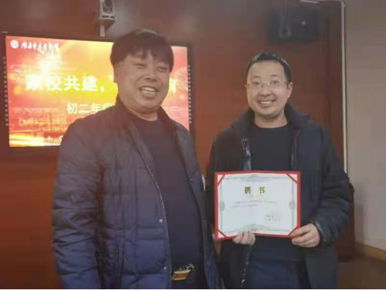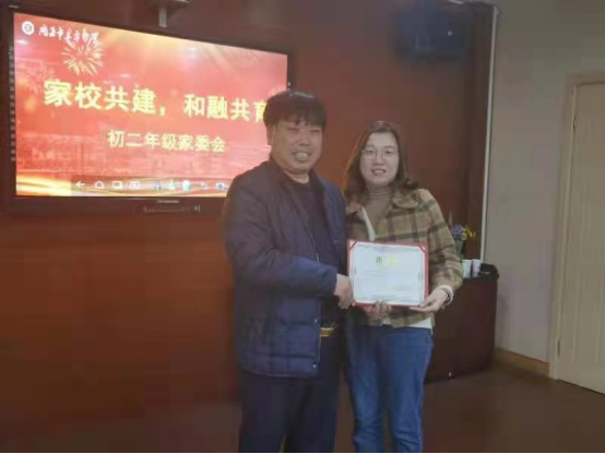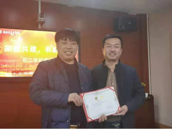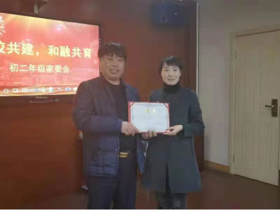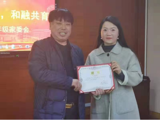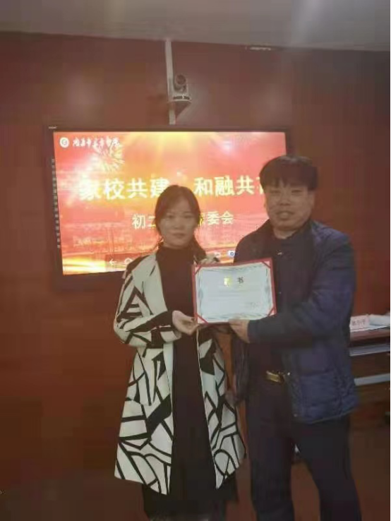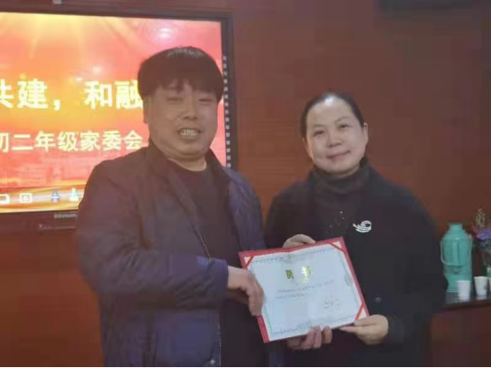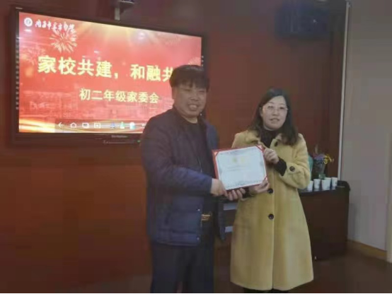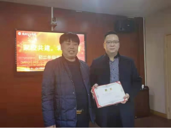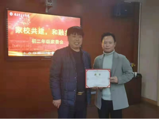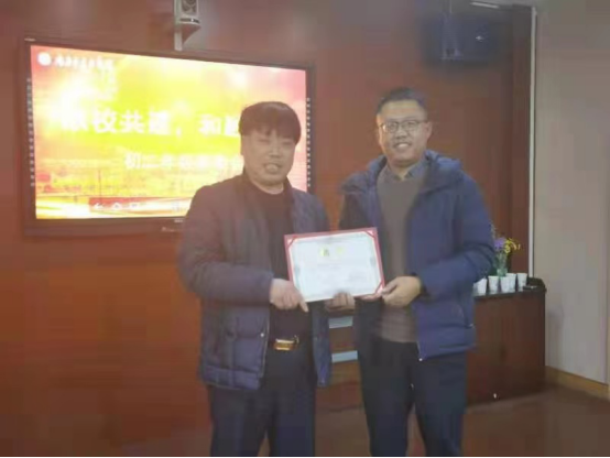 邵校长向家委会成员颁发聘书,祝贺大家成为东方中学初二年级部家委会的一份子。