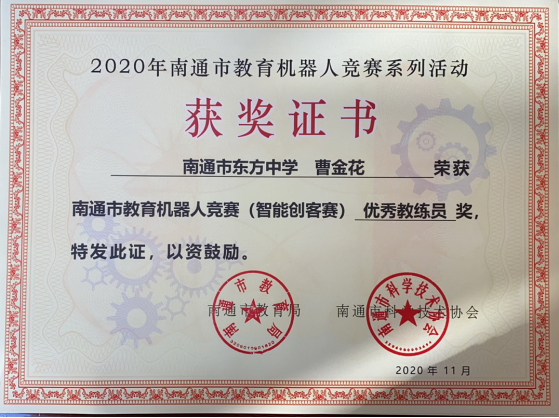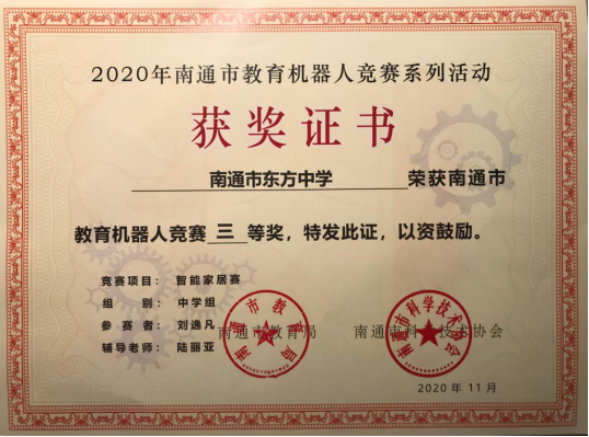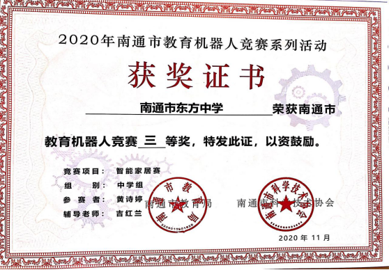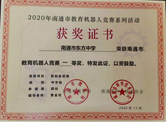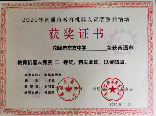 日前,由南通市教育局、南通市科协主办的教育机器人竞赛智能家居赛成绩揭晓,我校顾问同学获得了南通市一等奖,谢雨霏同学获得了南通市二等奖,刘逸凡同学和黄诗婷同学获得了三等奖,曹金花老师获得了优秀教练员的称号。