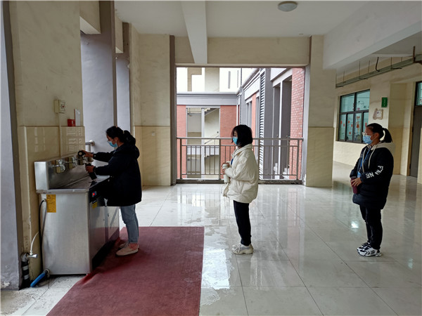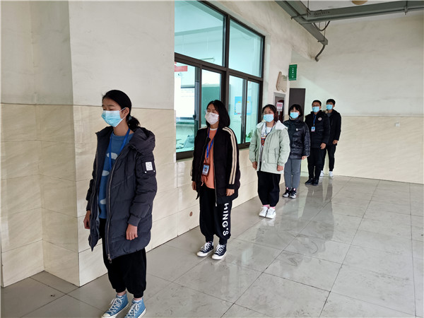 根据演练方案,参与晨检的老师提前到达校门口,做好学生晨检准备。学生到达校门处,按照演练安排在规定通道内按一米以上间隔距离有序进入校园,并按照规定路线直接进入教室。