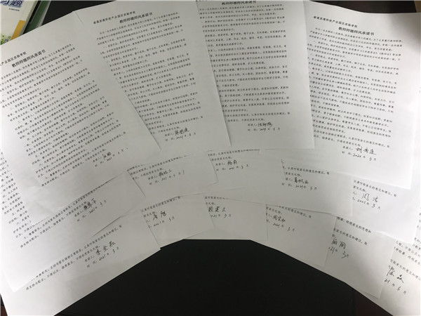 姚敏校长详细解读了《教师师德师风承诺书》的具体内容,进一步增强了教师的责任感、使命感、荣誉感。老师们郑重签名,并亲手将承诺书交到学校领导的手上。