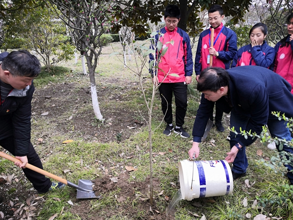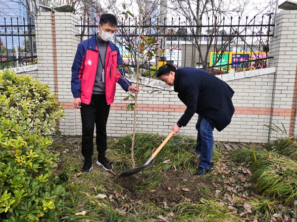在校园植树现场,教师党员、学生团员个个干劲十足,以饱满的热情投入到“播绿校园”行动中。你拿铁锹我拿锄头,大家互相配合,有的挥锹铲土、有的扶树填土、有的培土浇水,忙得不亦乐乎。看到一棵棵绿色的小树苗,师生们无不感到喜悦和满足。
