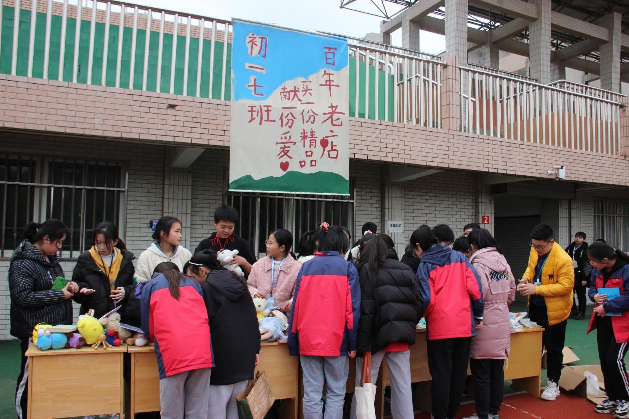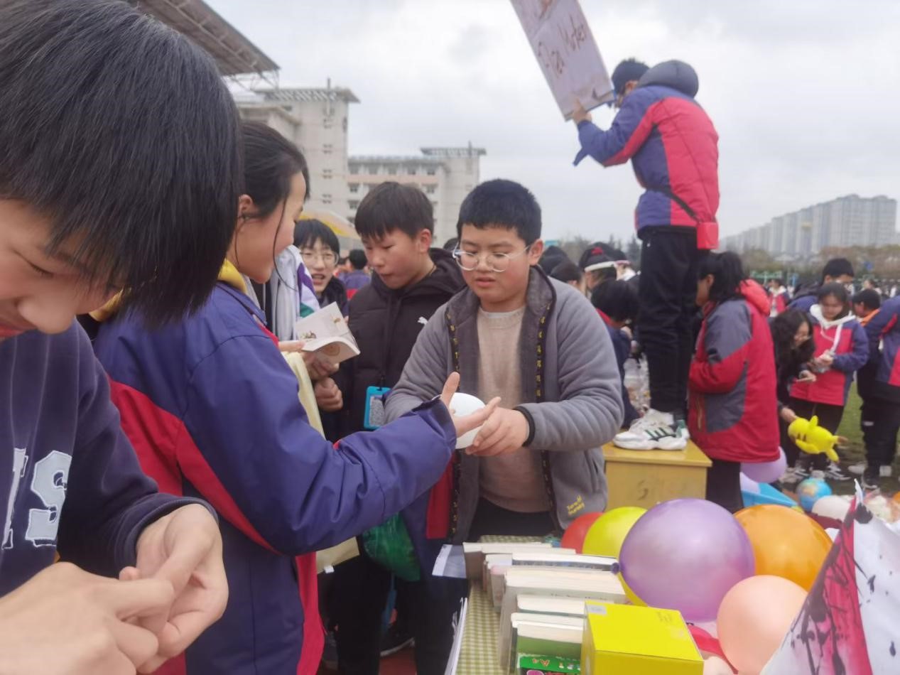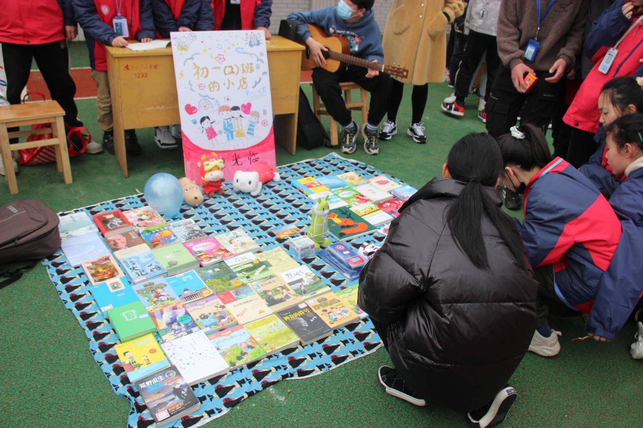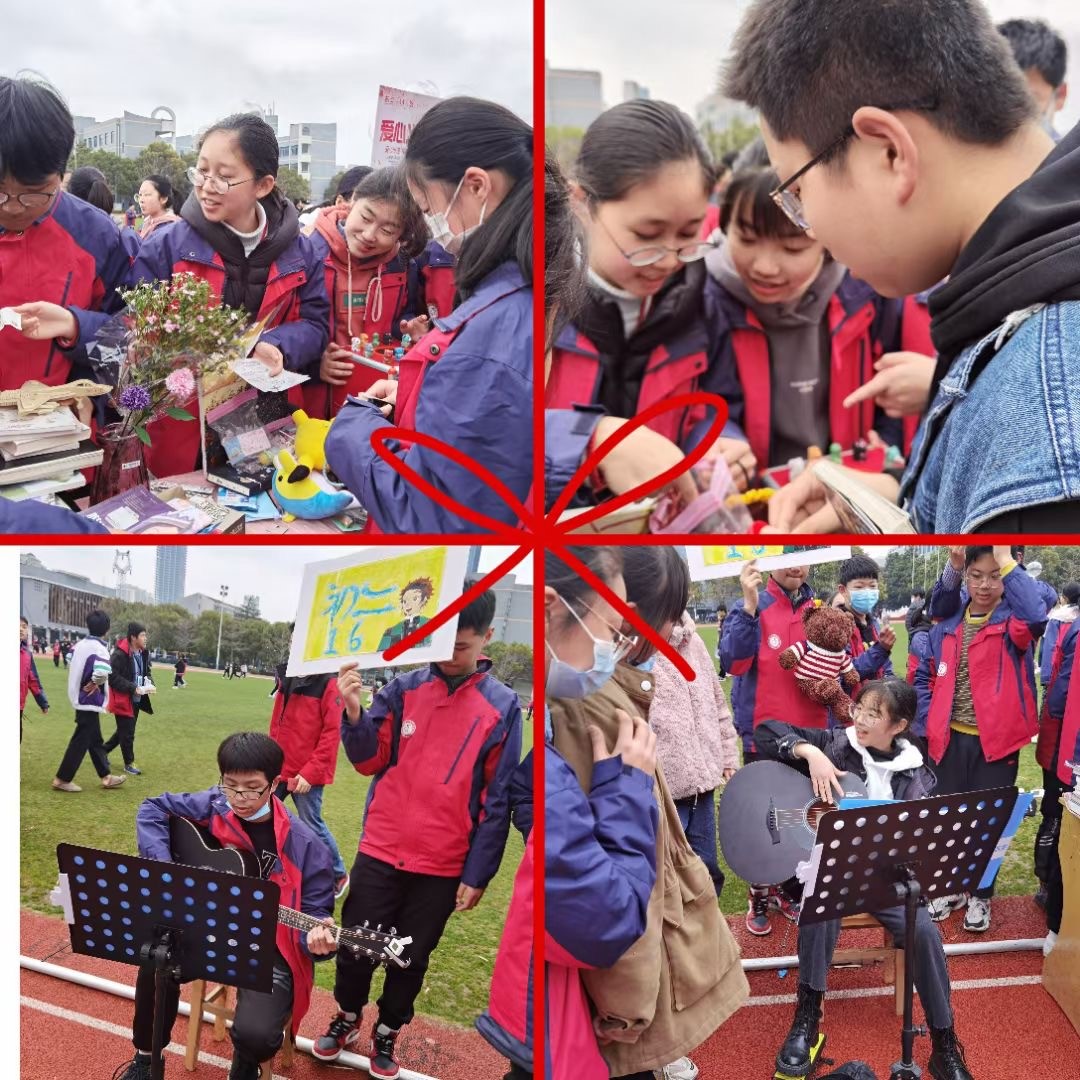 中午12:00音乐响起,各摊位旁,色彩缤纷又信息丰富的宣传吸引同学们纷纷驻足,“爱心驿站”、“爱心义卖—温暖启航”、“爱心义卖—犇向未来”……每班的宣传大使用图画与文字向同学们传递着雷锋精神,启迪和激励着同学们一心向善、互帮互助。更有的班级开启了弹吉他、套圈等娱乐活动来吸引各自摊位的人流,为义卖使出了浑身解数。