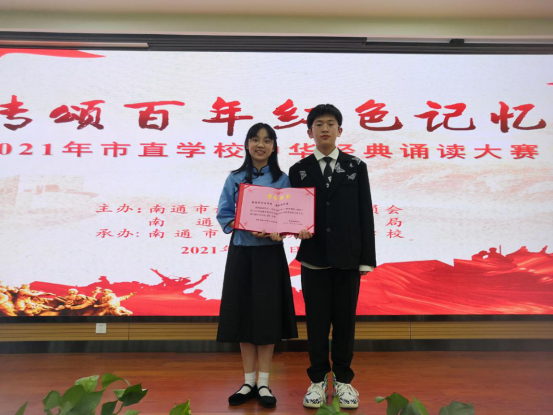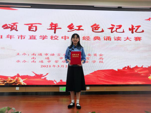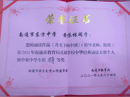 3月24日,由南通市语委、南通市教育局主办的2021年市直属学校中华经典诵读大赛现场个人赛在南通市紫琅湖实验学校举行,东方中学初一5班黄依林同学喜获中学生组特等奖。