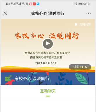 初中阶段,是孩子身体和心理的快速发展期。面对这一阶段的孩子,家长该如何更好地与他们进行沟通呢?3月30日,由南通市东方中学家长学校、南通市黄杰德育名师工作室共同举办的中学生心理健康、生命安全教育专题家庭辅导活动在致远楼录播教室顺利举行,全校家长通过在线直播的方式进行收看。