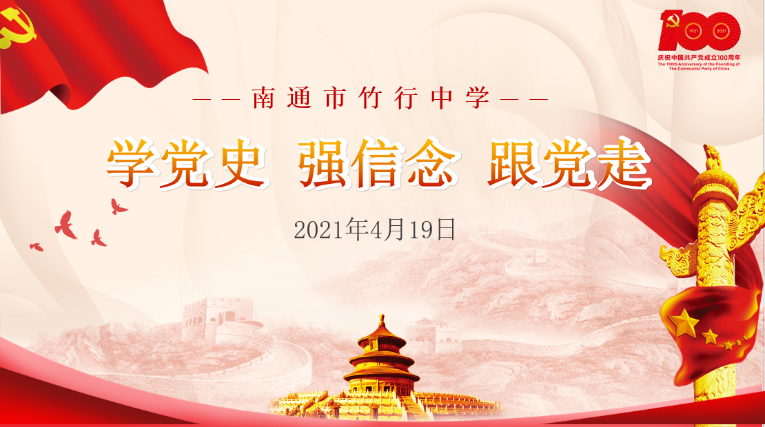 为深入贯彻习近平总书记新时代中国特色社会主义思想,迎接建党100周年,增强学生爱党、爱国的思想意识,4月19日,南通市竹行中学各班级开展了“学党史,强信念,跟党走”主题班会活动。