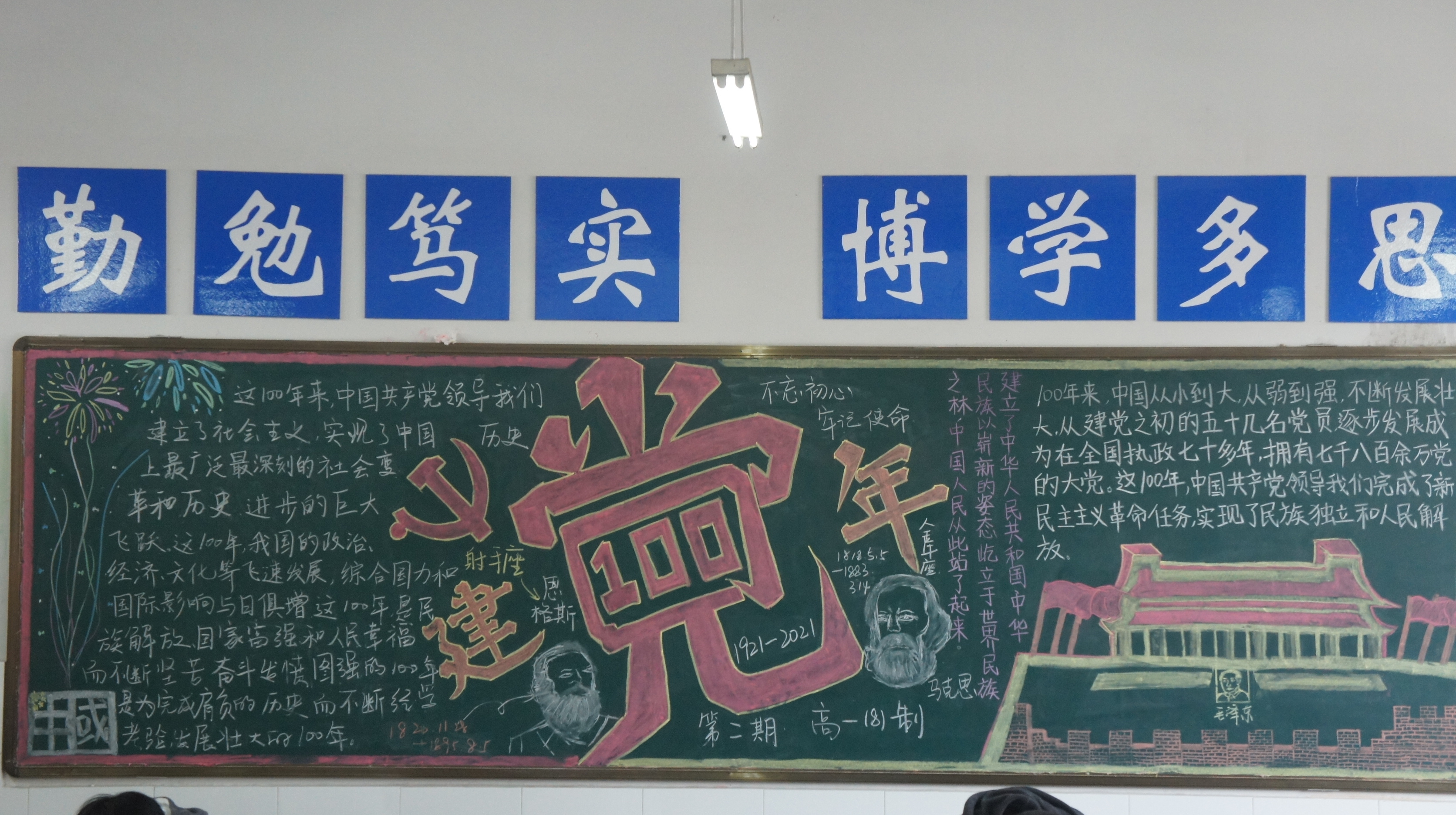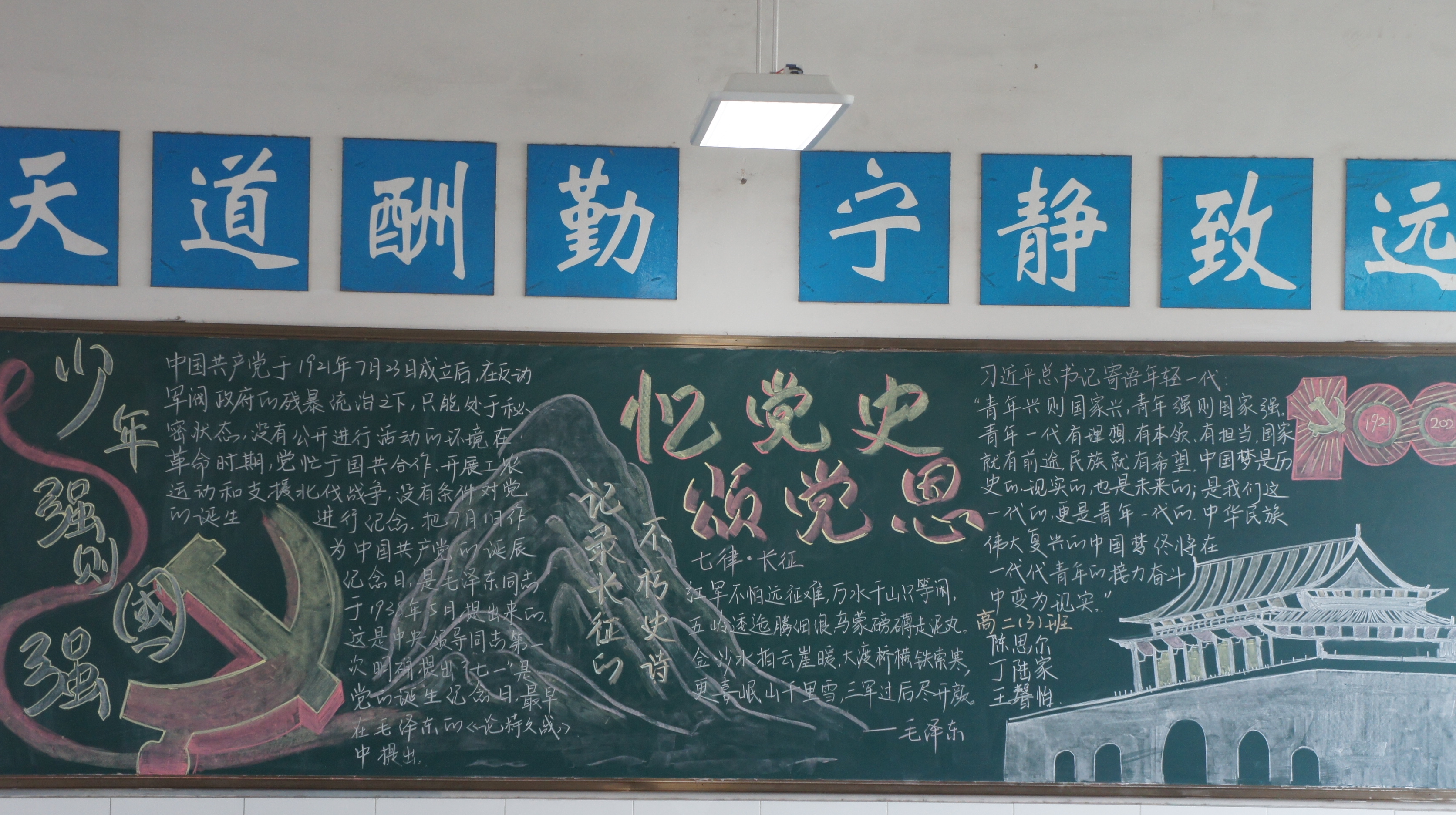 为深入学习贯彻习近平总书记在党史学习教育动员大会上的重要讲话精神,庆祝中国共产党成立100周年,回顾党的光辉历程、讴歌党的丰功伟绩,我校学生处联合团委在高一、高二年级开展了“学党史”主题黑板报评比活动。