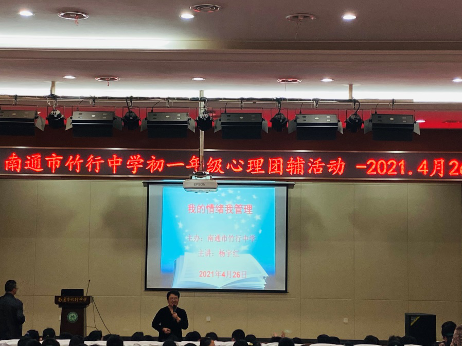 为进一步加强未成年人心理健康教育,帮助学生养成自尊自信、积极向上的意志品质, 4月26日下午,南通市竹行中学特邀国家二级心理咨询师、小海中学学生发展指导中心杨宇红主任来校开设了一场以“探寻情绪的秘密”为主题的心理团辅讲座。初一年级全体学生、班主任参加了此次活动。