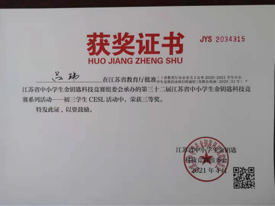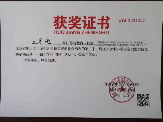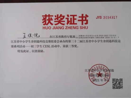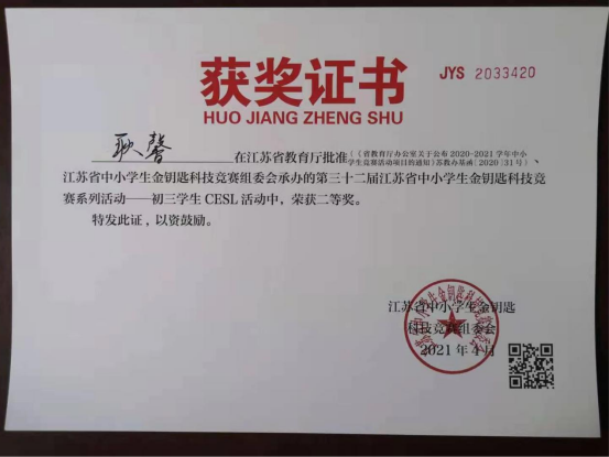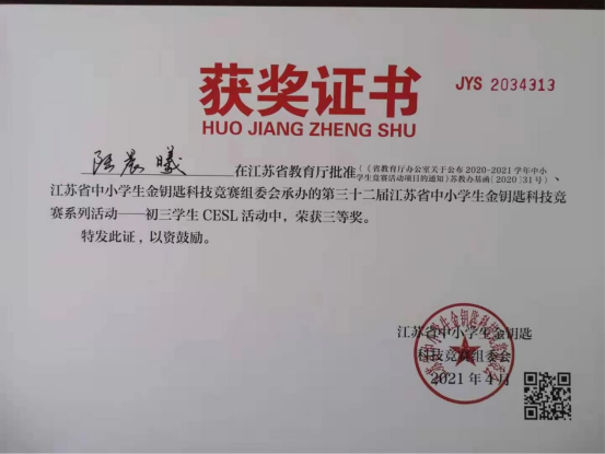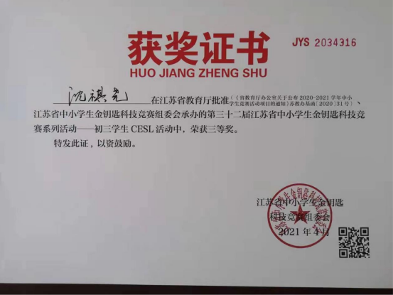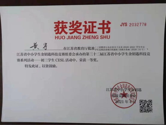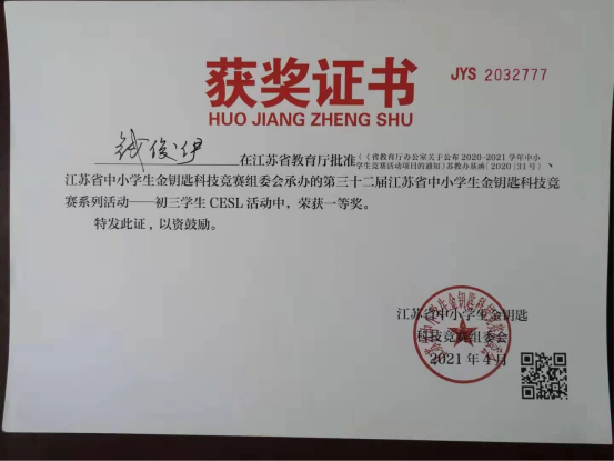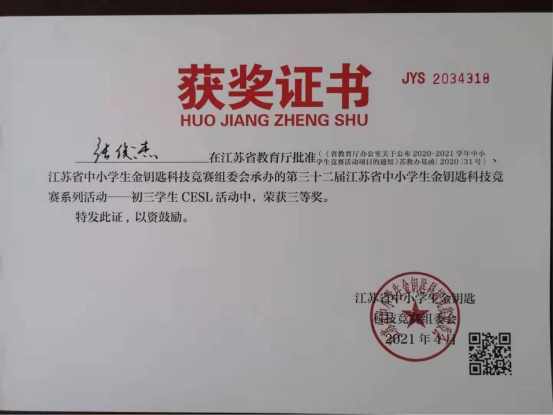 高能少年!——我校学子在三十二届江苏省金钥匙科技竞赛CESL活动中获奖