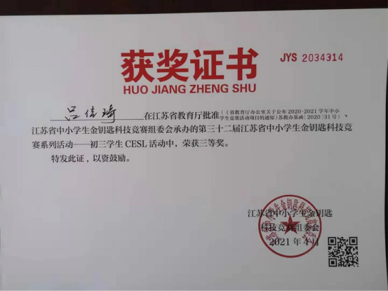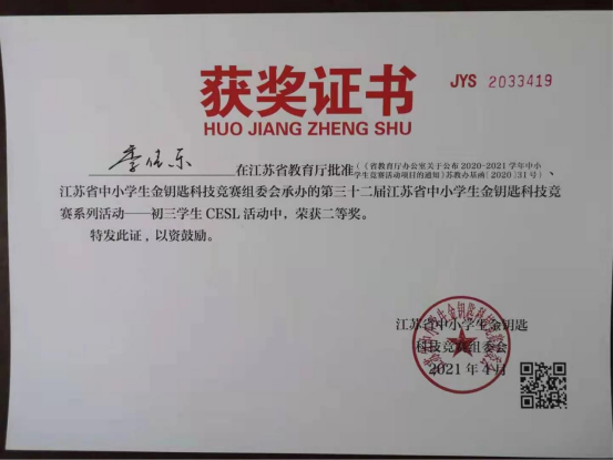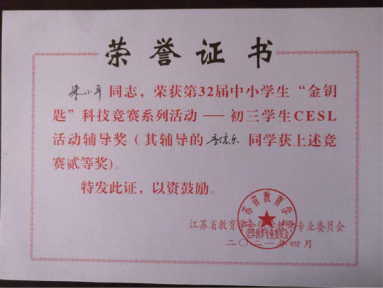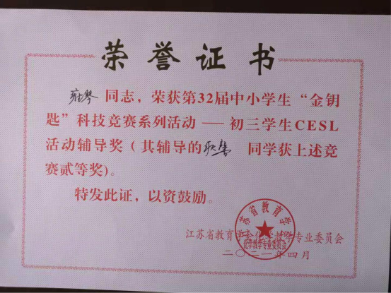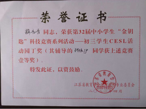 在刚刚结束的第三十二届江苏省中小学金钥匙科技竞赛系列活动——初三学生CESL活动中,我校黄宇等11名同学各展其才,过关斩将,在参赛选手中脱颖而出,最终以优异的成绩斩获个人一二三等奖,薛香香、朱小平、雍琴获优秀辅导老师的称号。