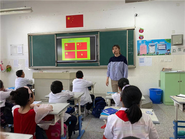 “同学们,这是我们中国共产党的党旗,中国共产党的党旗是一面缀有金黄色党徽图案的红旗·····”走进四年级各班,学生们整齐就坐,认真聆听。老师们分别从学习党旗与党徽知识、教唱《没有共产党就没有新中国》及讲述中国共产党的诞生、认识领袖人物、了解经典战役等各角度,为学生们带来了一堂生动且意义深远的主题班会课。