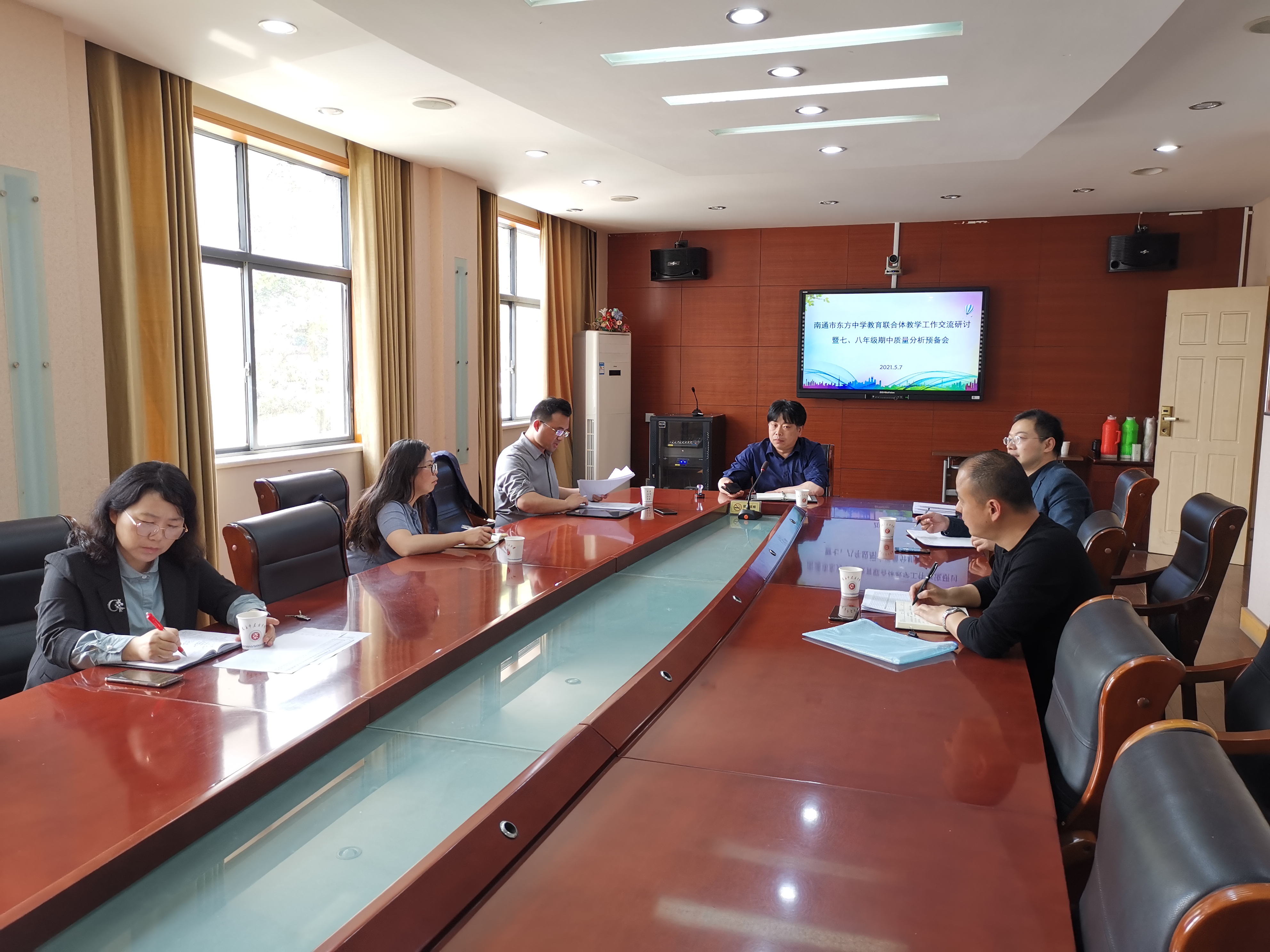 为进一步聚焦教学,共商下阶段教学对策。5月8日下午,南通市东方中学教育联合体教学工作交流研讨暨七、八年级期中质量分析预备会在东方中学乐英楼底楼会议室召开。各成员学校教学副校长出席会议。会议由分管教学副总校长沈明明主持,总校长邵海兵到会指导。