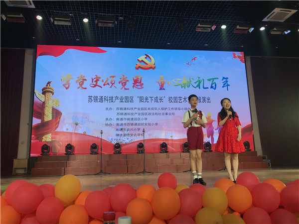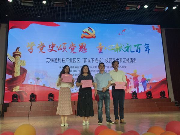 5月25日下午,庆祝中国共产党成立100周年苏锡通科技产业园区“学党史颂党恩,童心献礼百年”校园艺术节汇报展演在锡通园区小学举办。我校选送的音乐剧节目《阳光下的大课间》获评一等奖,舞蹈《走进山水间》、合唱《春晓》获评二等奖,我校获“优秀组织奖”。