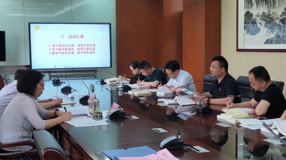接着,沈明明书记就学校5月份以来的党史学习教育进行了汇报。沈书记从完善工作方案、推进方案实施、解答“为民办实事”三个方面展开,阐述了将党史学习融入到日常的业务工作中,真正地做到“学史力行”,特别是5月份学校对全体师生展开的“为民办实事”问卷调查和数据分析,沈书记表示各部门要进行责任分解,逐步完善和解决,力求真正地提升师生的获得感和幸福感。