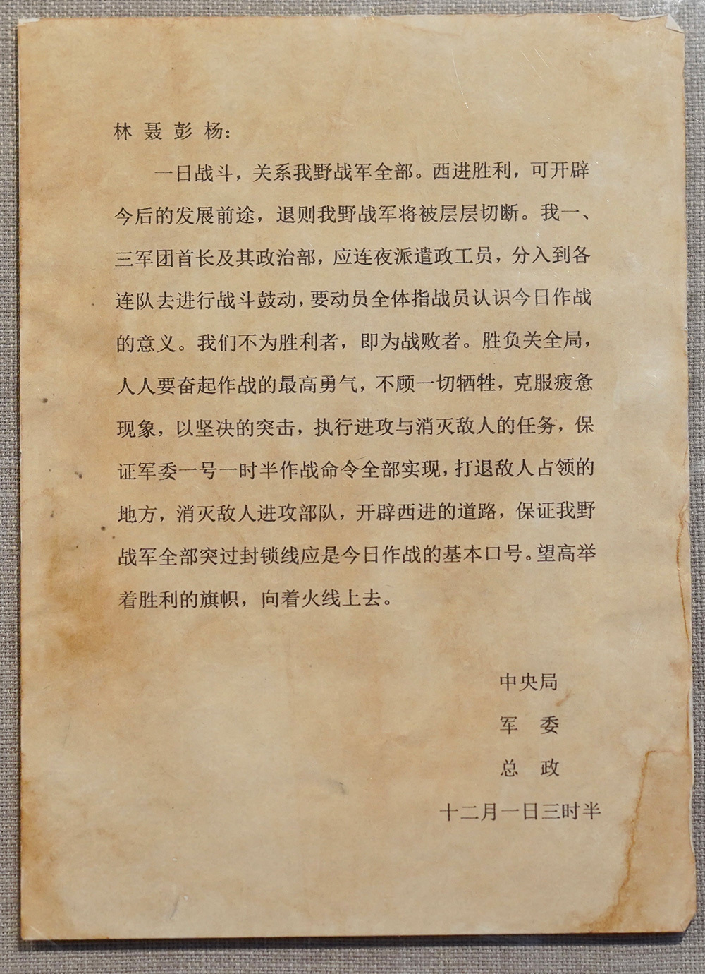 陈列在湘江战役纪念馆的电报(总台央广记者潘毅拍摄)