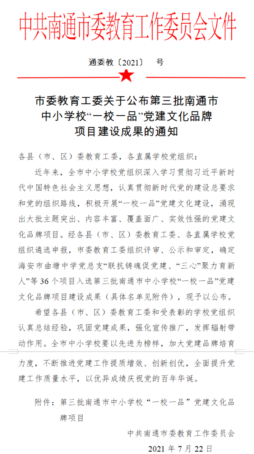在中国共产党成立百年之际,竹行中学“有节”党建铸师魂,有为青年共成长项目入选第三批南通市中小学校“一校一品”党建文化品牌项目建设成果。