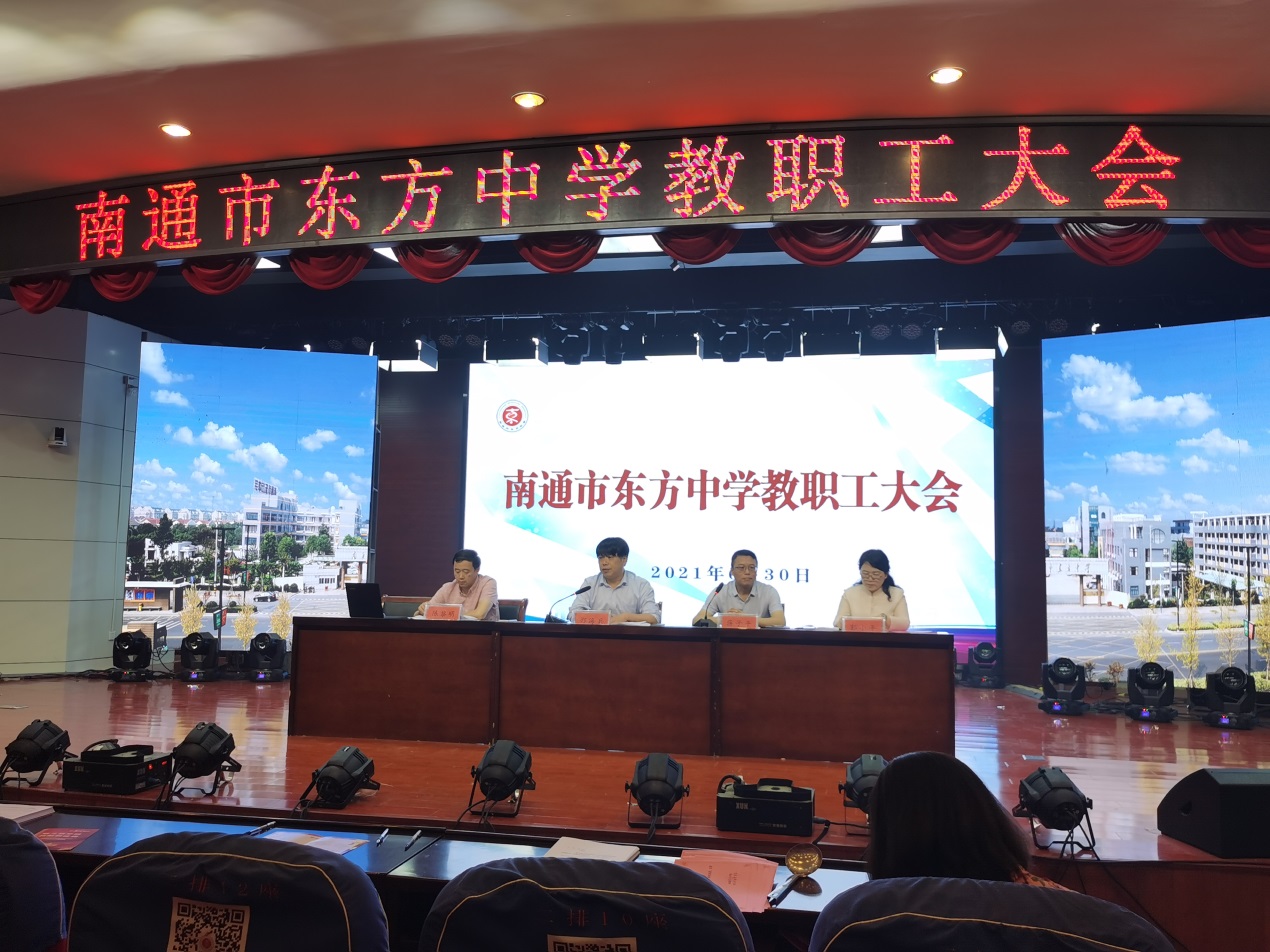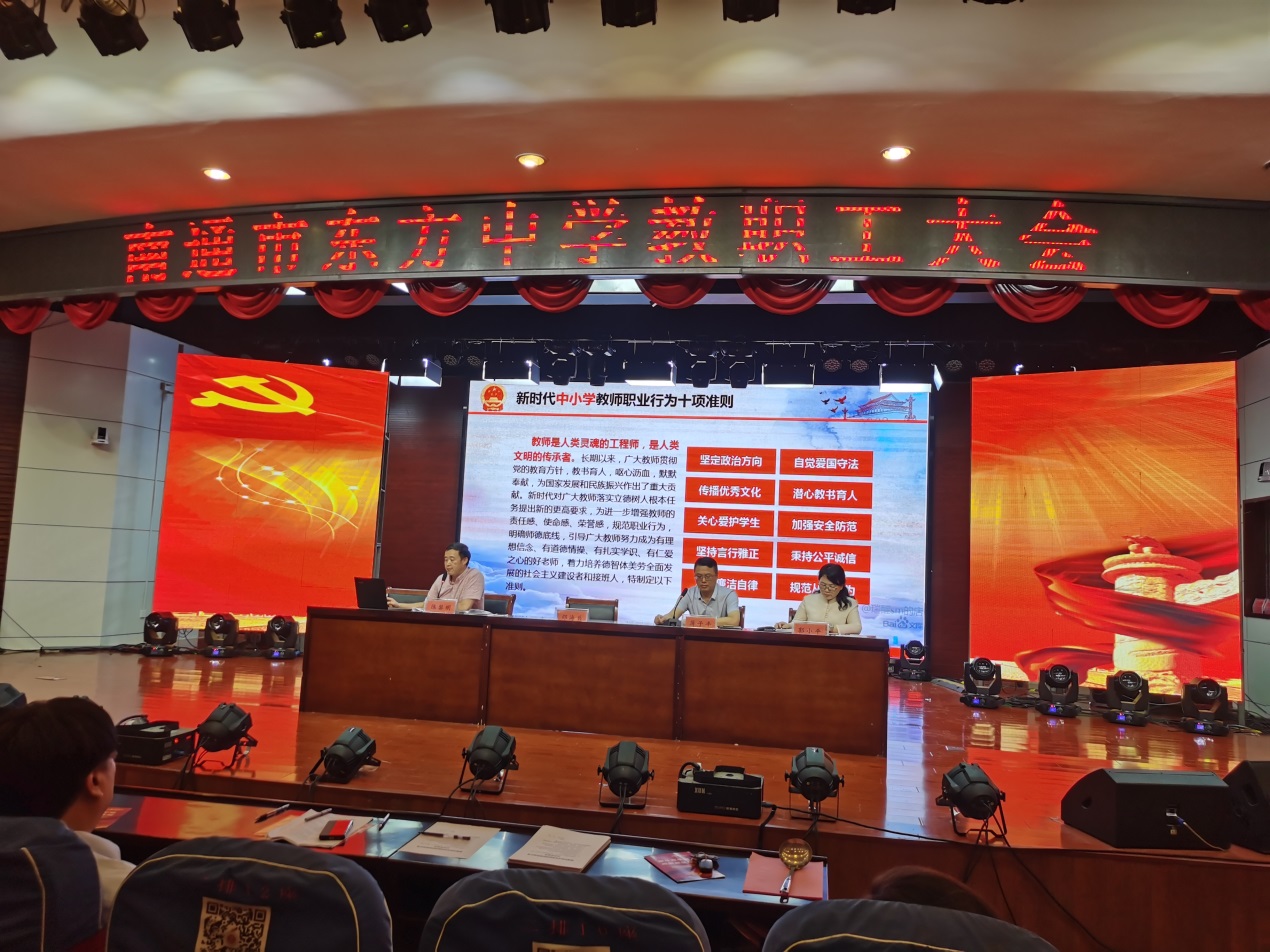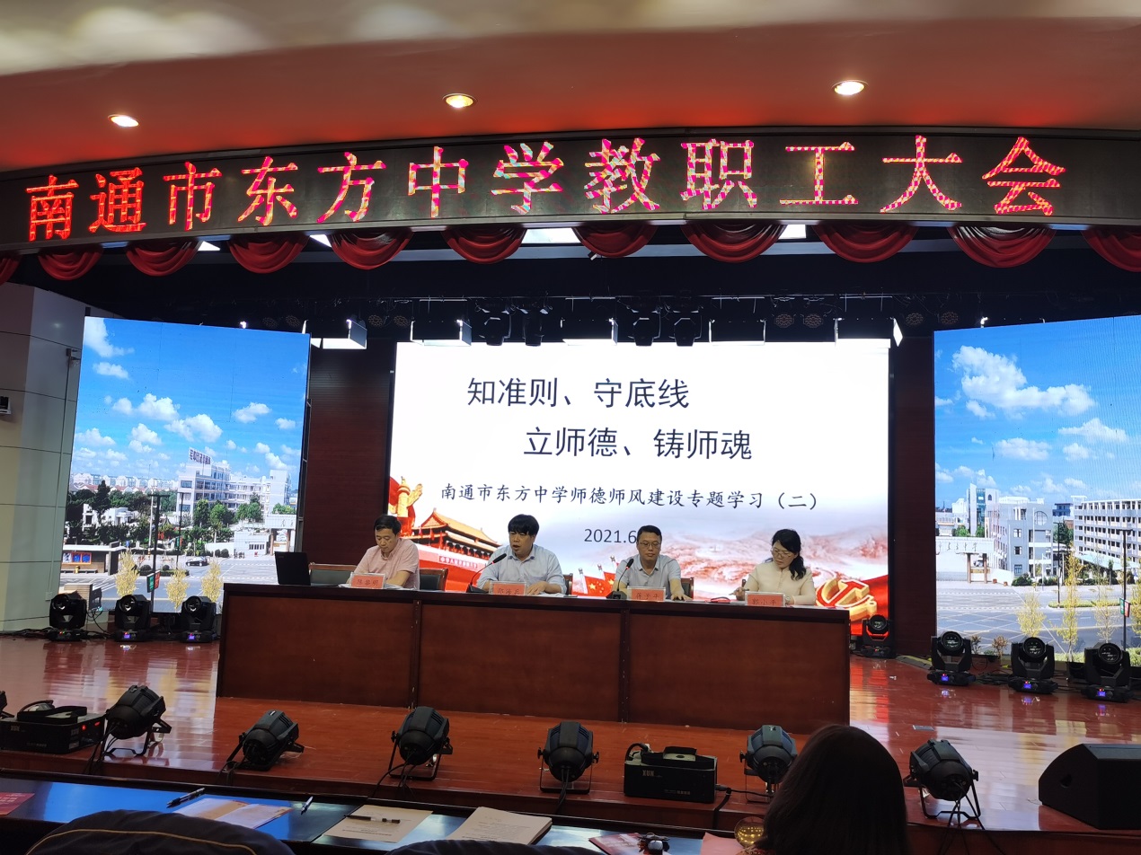 6月30日,南通市东方中学全体教职工大会在学校西区报告厅举行,陈黎明副校长带领全体教师进行了主题为“知准则、守底线、立师德、铸师魂”的师德师风的专题学习。