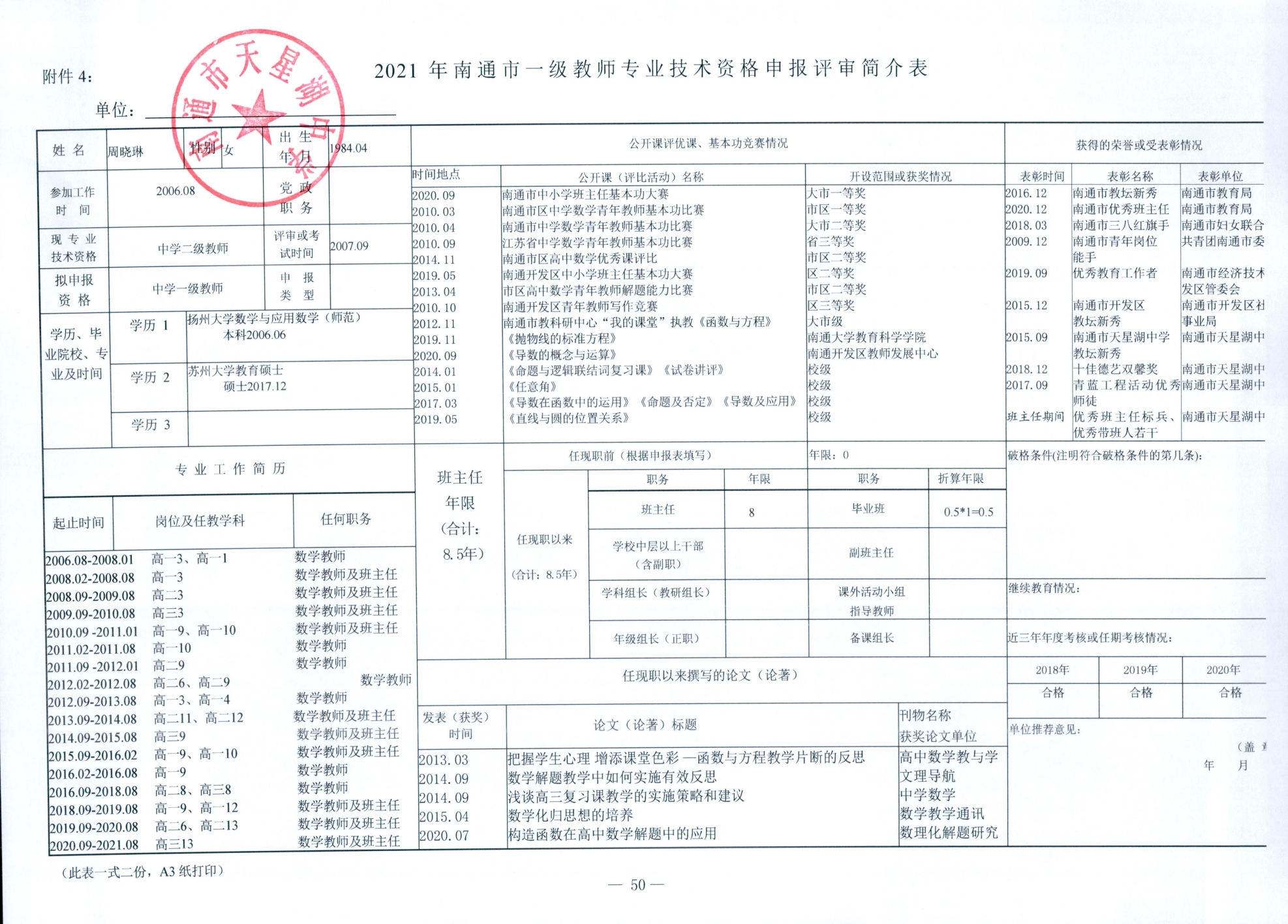 根据《市教育局关于印发2021年全市中小学和中职校教师职称评审工作意见的通知》文件和《2021年南通市中小学一级教师(含初定)职称评审工作的意见》文件精神,以及市教育局职评工作会议精神,经教师自主申报、公开述职、民主测评、专家评审,2021年一级职称申报拟推荐名单如下: